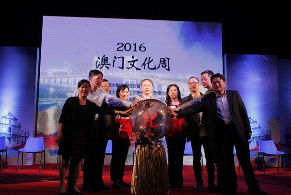 当晚,澳门文化周开幕式暨专题文艺晚会在灯光篮球场举行。曾路、林辉莲分别致辞,随后,主礼嘉宾们共同按下“2016年澳门文化周启动球”。文艺表演精彩纷呈,港澳学生金龙队炫丽亮相,技惊四座;双人舞《缠绵》展示了舞蹈的专业与柔美;二十四节令鼓《源》鼓声震撼;小组唱《最美的太阳》和印度舞表演充满青春朝气;现场小游戏拉近了观众与舞台的距离,晚会在澳门学生的大合唱《一个神奇的地方》中落下帷幕。晚会进行的同时,来自老挝、缅甸、印度尼西亚、马来西亚等国家以及港澳台地区的学生还在现场精心准备了东南亚文化与美食展。