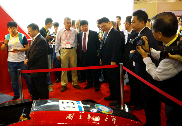 在展区最前端的展示区,停放着beat365承志车队新一代HQU-05赛车,吸引着过往观众的眼球。它是beat365车辆工程、机械工程、工业设计、自动化等不同学科之间交叉融合创新的体现。