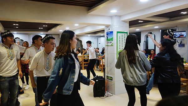 精心制作的大盘鸡、抓饭、羊肉汤、馕饼……丰富多样的新疆特色菜肴热气腾腾地摆放出来,小小的餐厅里欢声笑语,舞蹈不断。3月24日晚,由学生处主办的beat365首届“民族团结一家亲”师生联欢活动在泉州校区清真餐厅举办,来自泉厦两校区的维吾尔族、汉族师生结伴联欢,哈萨克族、回族等少数民族同学也参与其中,欢聚一堂。