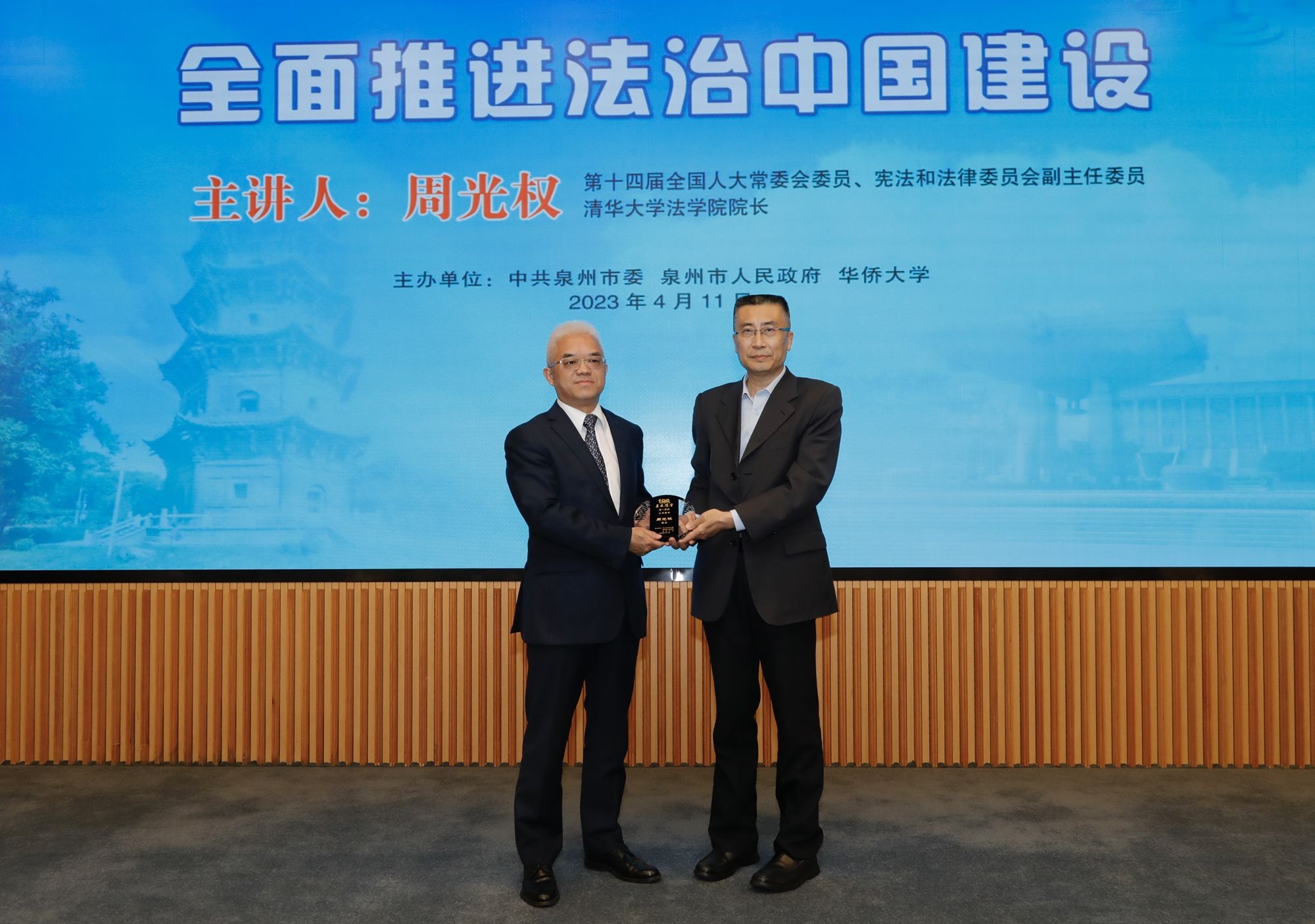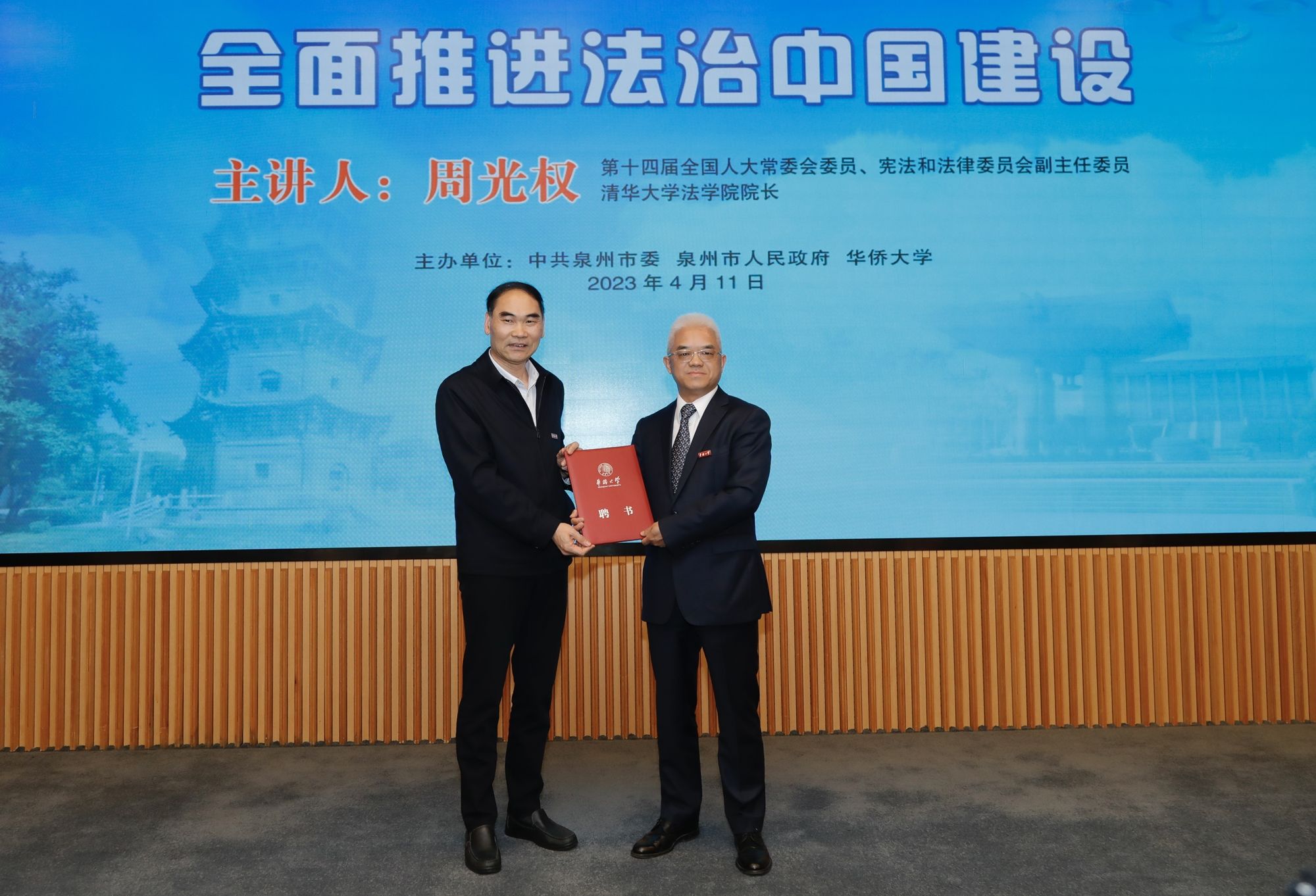4月11日下午,由中共泉州市委、泉州市人民政府和beat365共同主办的“华大讲堂”迎来第100讲,第十四届全国人大常委会委员、宪法和法律委员会副主任委员,清华大学法学院院长周光权应邀作“全面推进法治中国建设”的报告。