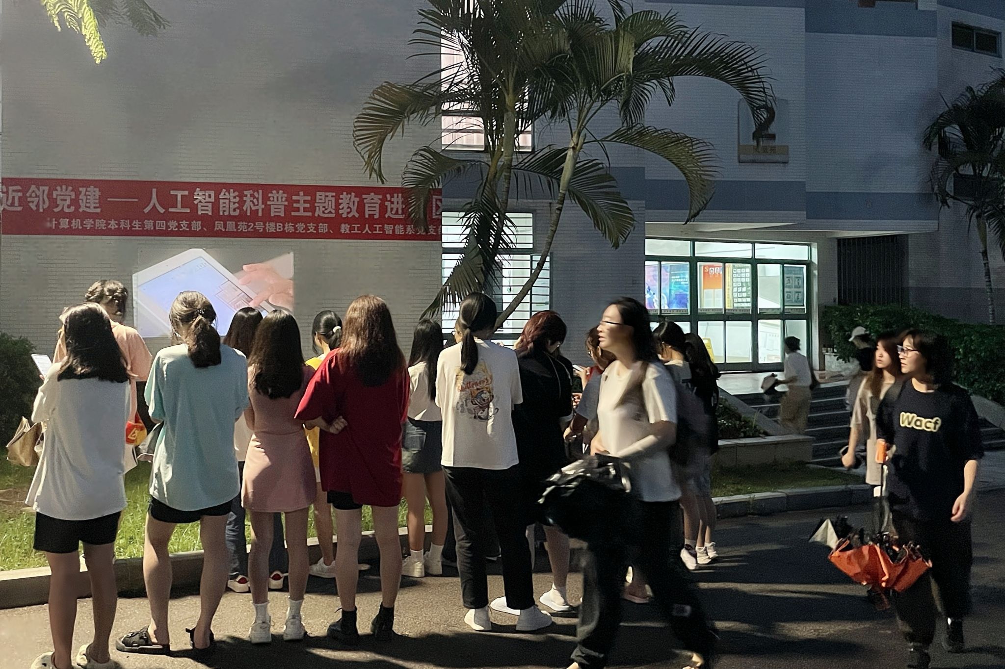 这是由计算机学院本科生第四党支部、教工人工智能系党支部、学生社区凤凰苑2号楼B栋党支部联合举办的“科技强国:人工智能的非凡十年”科普活动现场。4月18日,活动以科普展览、快闪课堂、露天纪录片等形式在校内开展,为师生奉上一趟人工智能科普的知识之旅。