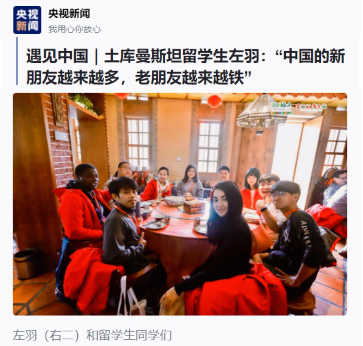 央视新闻客户端以“中国新朋友越来越多,老朋友越来越铁”为题,介绍受益于中国与土库曼斯坦的教育协议,左羽成为土库曼斯坦第一个拿到中国政府奖学金的学生来到中国学习。报道中,左羽分享了在校的学习生活情况。目前她正在做“中亚五国青少年中国形象认知调查研究”,希望通过这项研究了解该地区青少年对中国形象认知的真实看法,为在中亚地区如何塑造及传播良好的中国形象提出可行性建议。