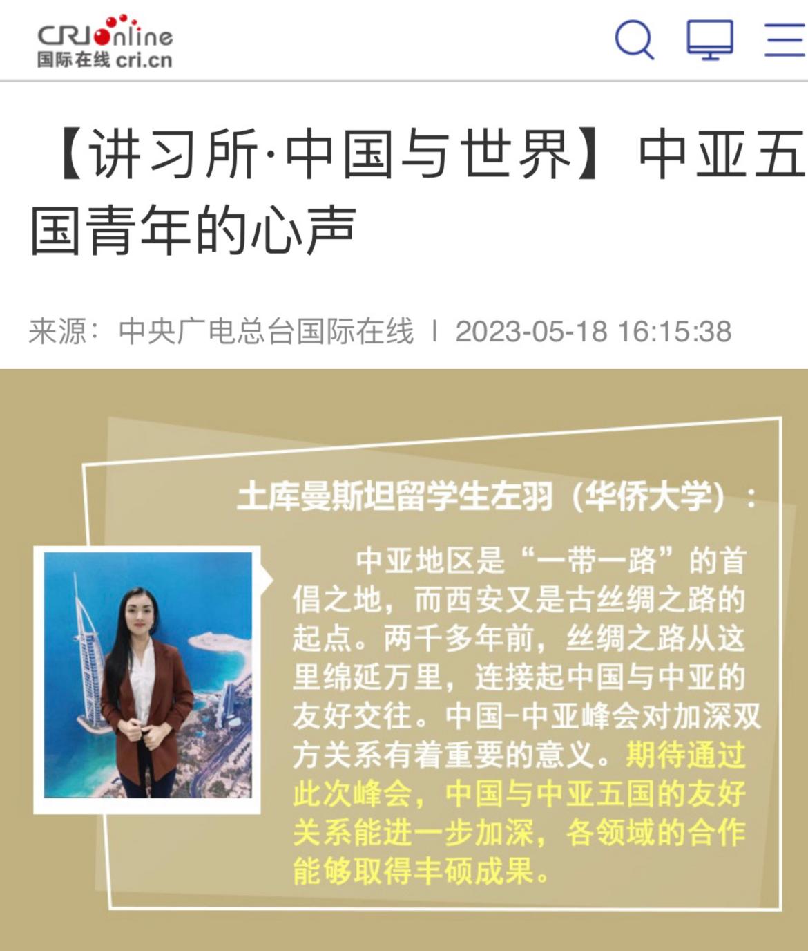 近日,央视新闻客户端和中央广播电视总台国际在线等系列报道关注来华留学中亚青年的故事。其中,beat365土库曼斯坦留学生左羽接受采访,讲述她从土库曼斯坦到中国的情缘。