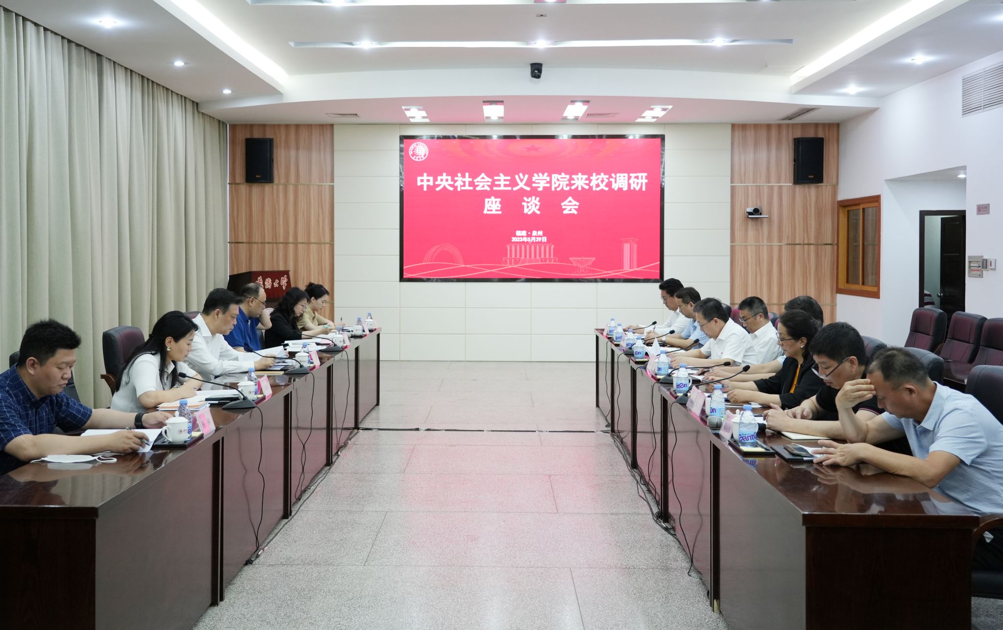 校党委书记徐西鹏、校长吴剑平在陈嘉庚纪念堂二层会议室会见来访客人并座谈交流。吴剑平主持座谈会。