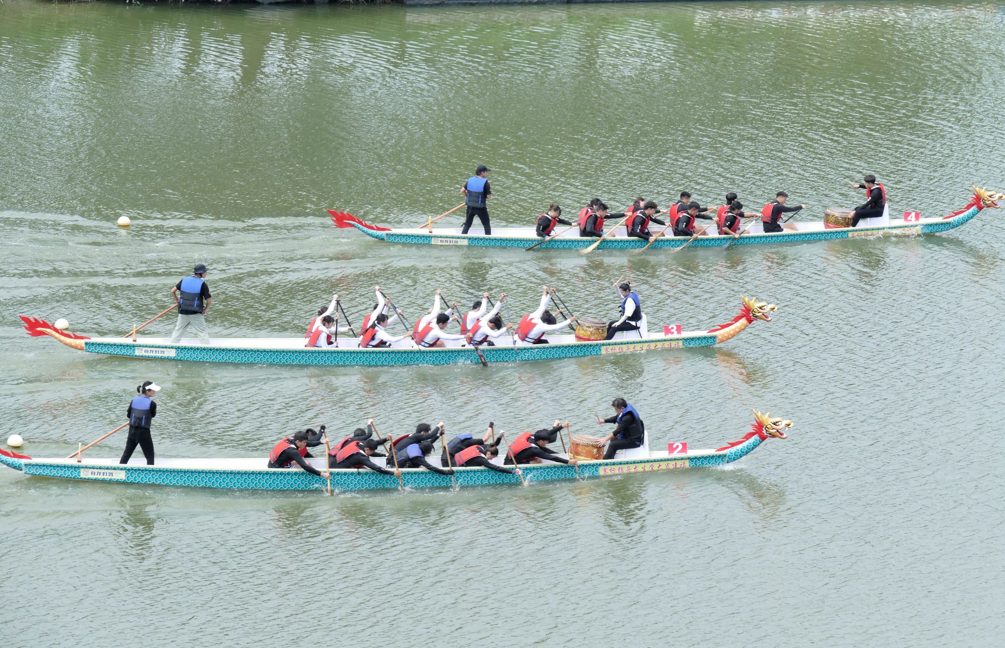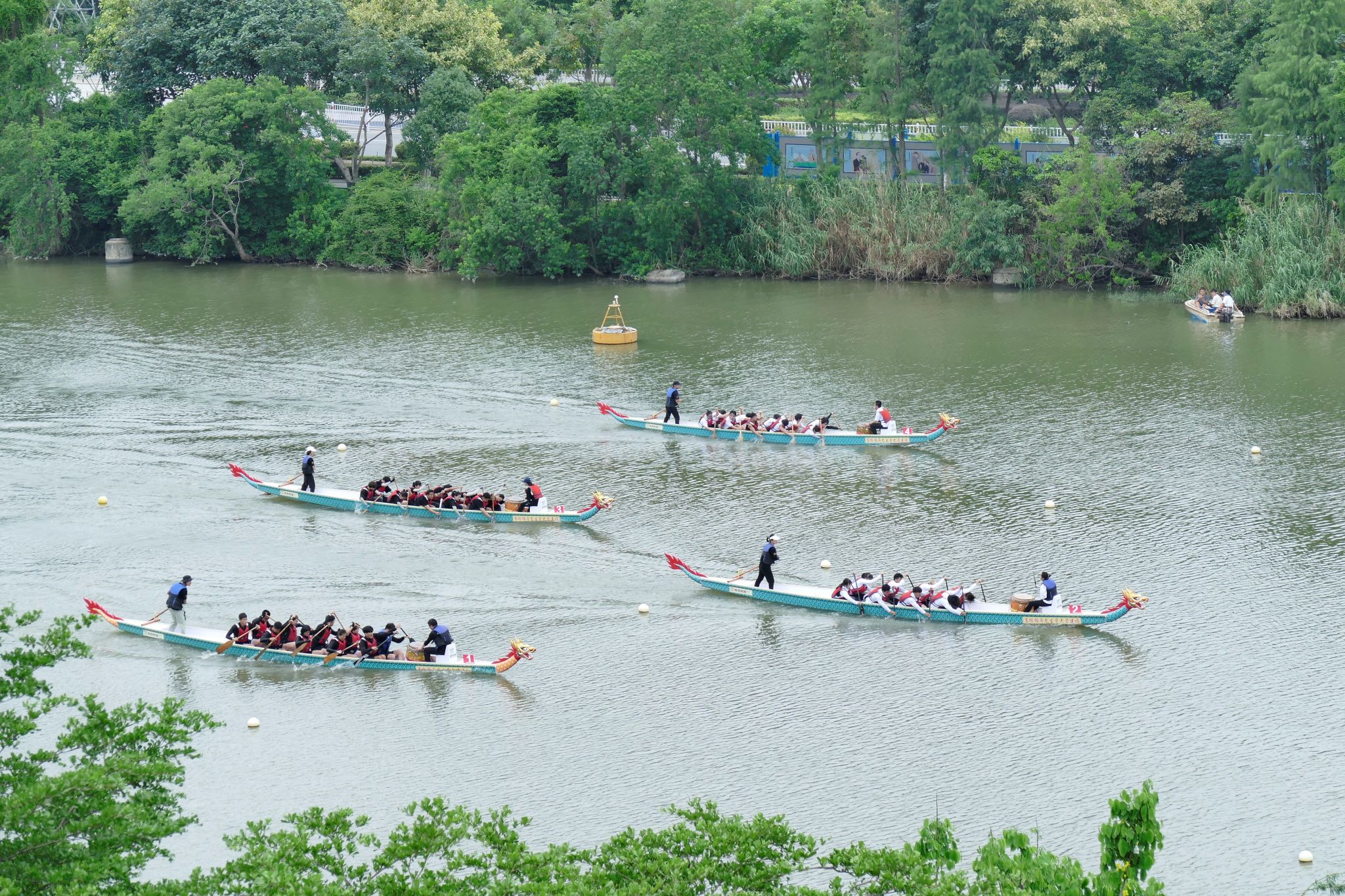 当日上午,二十四节令鼓队鼓点铿锵,随着龙舟点睛仪式的完成,比赛正式开始。发令枪响,各组龙舟队奋力挥动船桨,以乘风破浪的气势冲向终点。