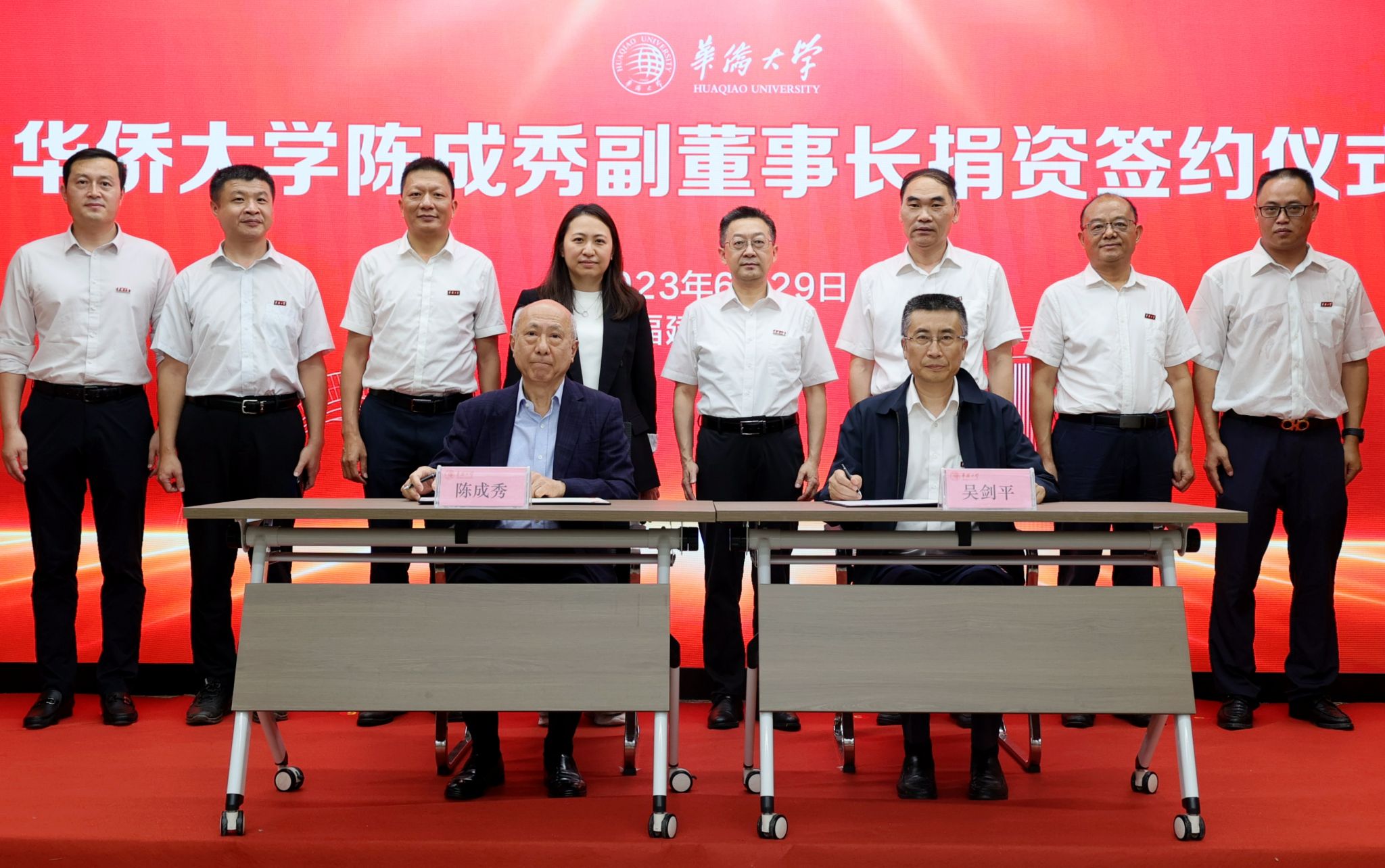 吴剑平与陈成秀先生签署捐赠协议,并代表学校向其颁发捐赠证书,对其慷慨善举表示衷心感谢。