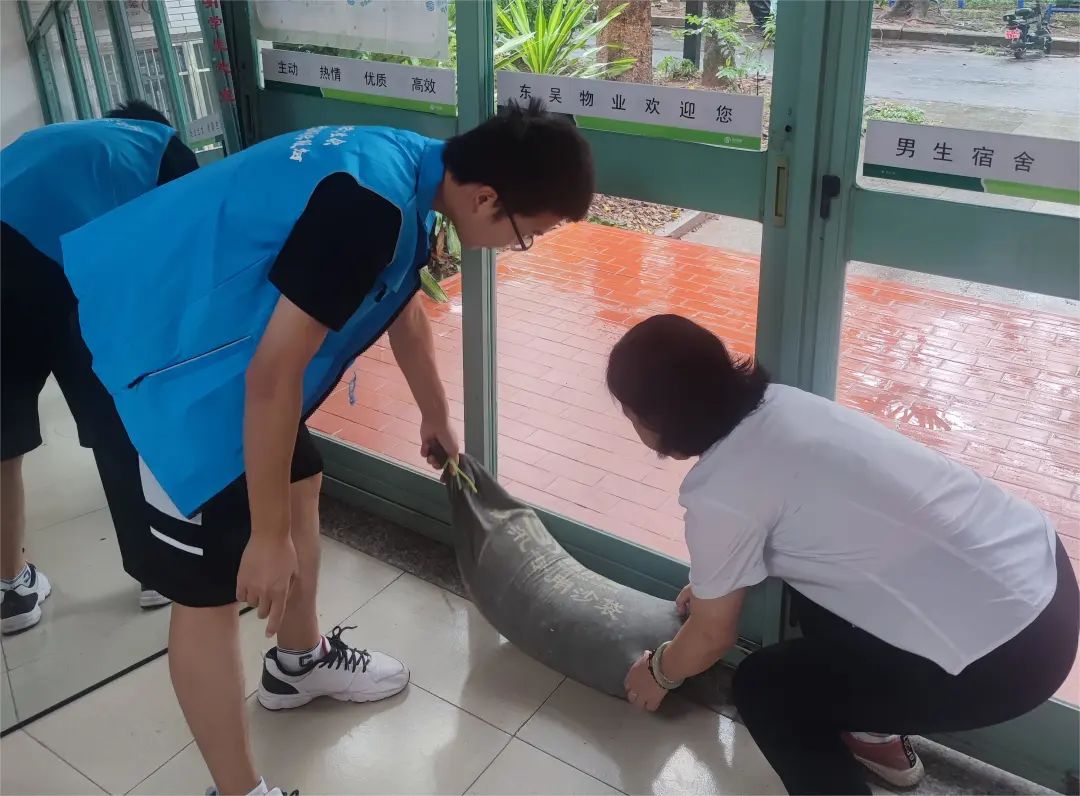 校学生会同学协助楼栋管理员做好台风预防工作