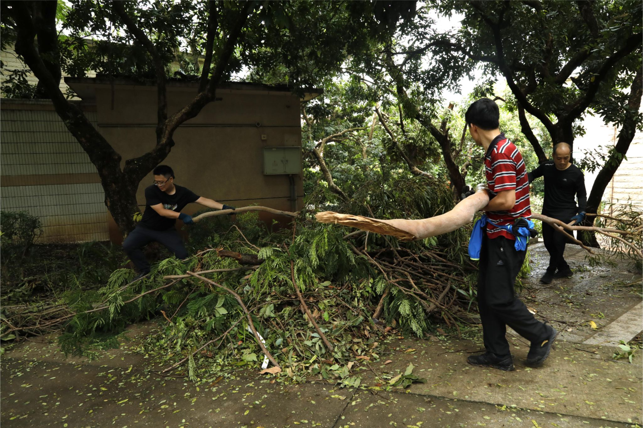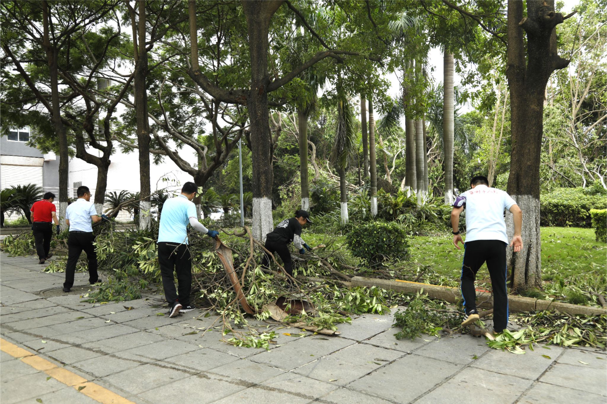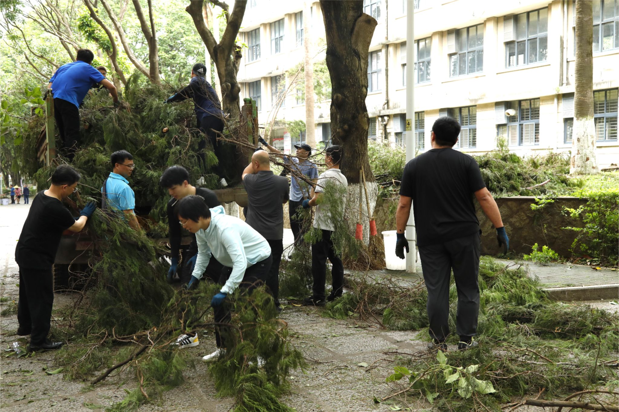 志愿者们在后勤工作人员的统一指挥安排下,手持扫把、铁耙、锄头、铁铲、畚斗等工具,兵分四路开展行动,有序前往主干道、教学楼、住宿区、运动场等区域,清理道路、水沟及绿化带上的断枝、枯叶;扶正花盆、垃圾桶、自行车、电动车及运动场地内座椅等倒伏物品;挪开阻碍交通的断木……