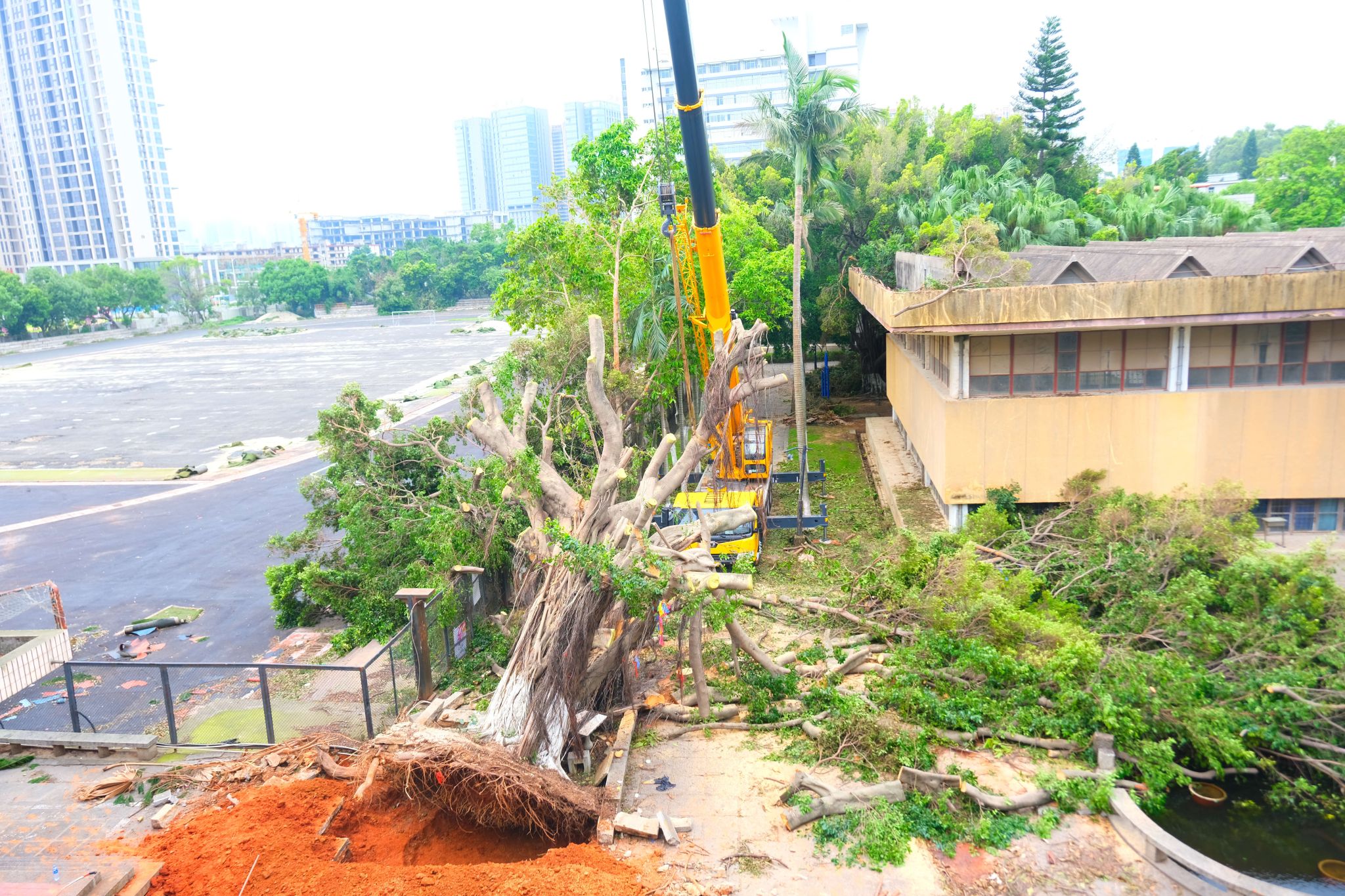 7月28日,泉州遭受“杜苏芮”洗礼,华园受损严重。台风过境,四处都是倒木碎枝,树木倒伏和大型树枝断干超过400棵。而最为触目惊心的,莫过于这棵被狂风连根拔起的大榕树。因其倒塌、连根拔起在地面造成的巨大豁口,雨水和着鲜艳红土的景象,让通过视频、图片看到这一幕的师生、校友们担心不已——“北操门口的大榕树倒了”“军训时给大家遮荫的大榕树没了”……