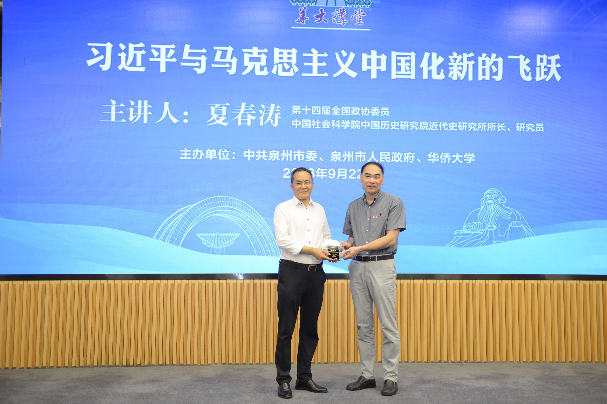 王秀勇为夏春涛颁授“华大讲堂”主讲嘉宾纪念牌