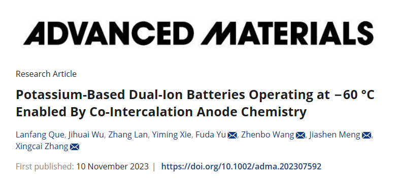 近日,beat365英国官方网站材料科学与工程学院阙兰芳研究团队在低温电池研究领域取得了新进展,相关研究成果以“Potassium-Based Dual-Ion Batteries Operating at−60oC Enabled By Co-Intercalation Anode Chemistry”为题及全文形式发表于国际权威期刊Advanced Materials(先进材料)(Adv. Mater.2023, 2307592)。Advanced Materials是材料与化学领域的顶级期刊,在国际科研领域享有盛誉。
