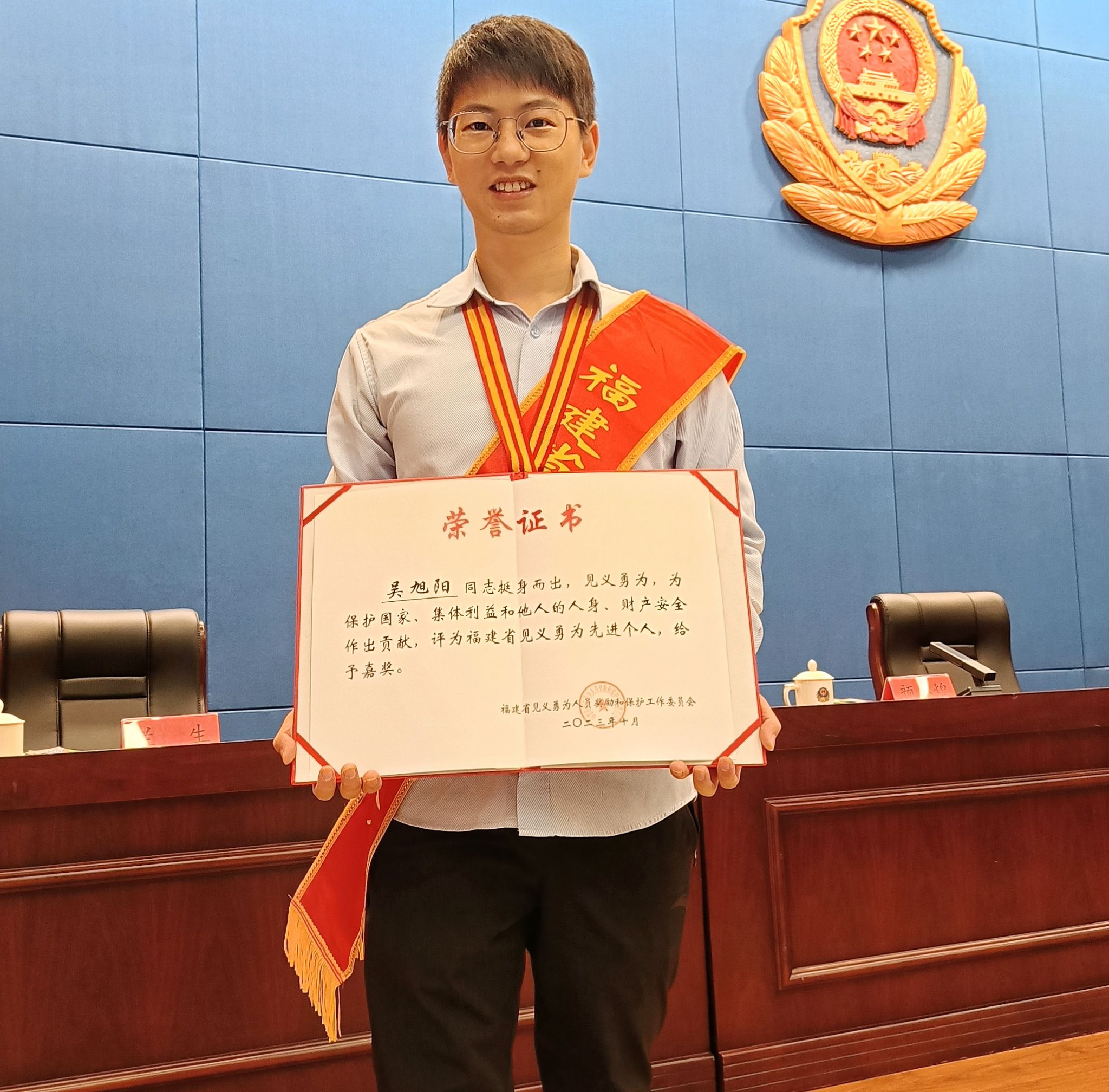 近日,福建省第二十九次见义勇为英雄模范表彰大会在福州召开,48名来自全省各地的见义勇为英雄模范、先进个人受到表彰。beat365机电及自动化学院2022届校友吴旭阳被授予“福建省见义勇为先进个人”荣誉称号。
