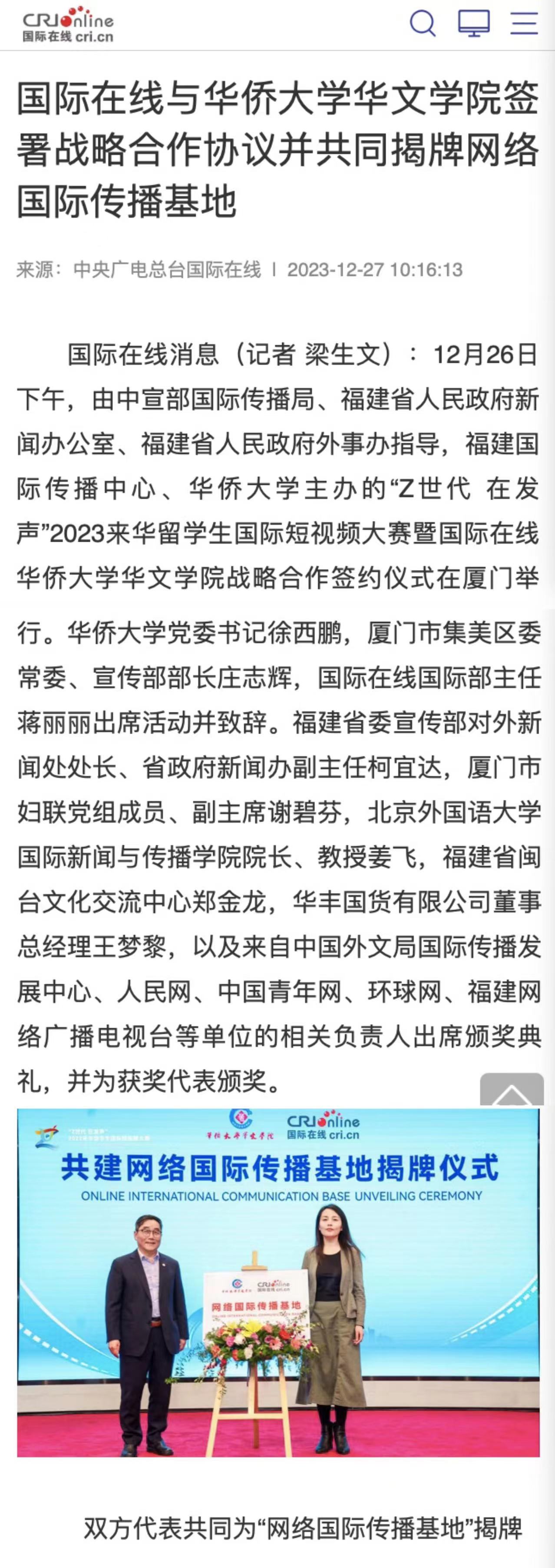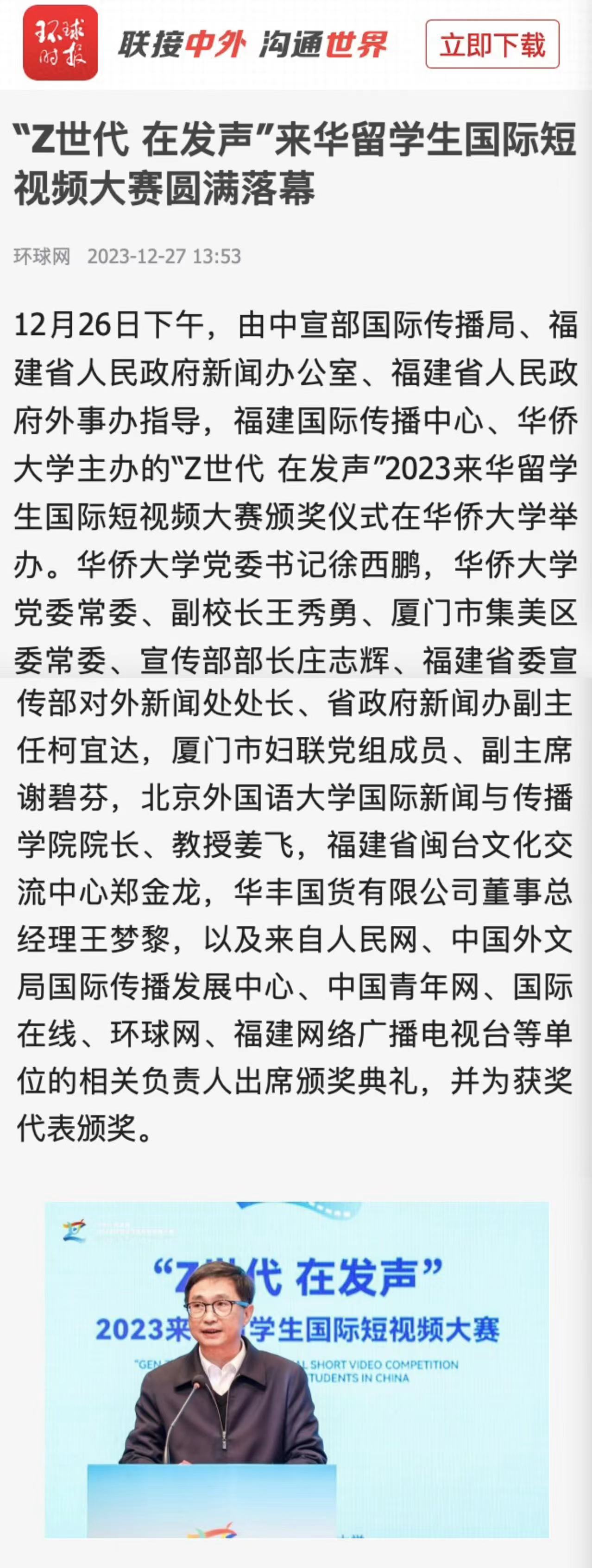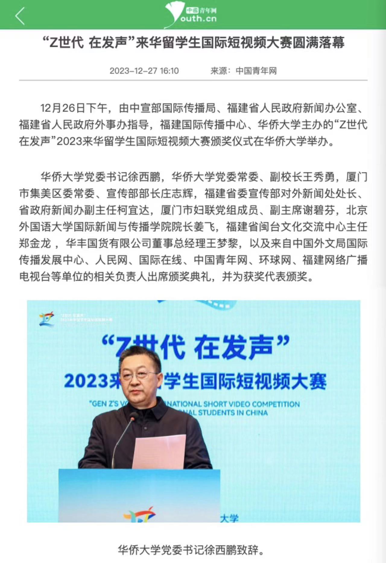 近日,在华大落幕的“Z世代 在发声”2023来华留学生国际短视频大赛引发关注,大赛启动仪式、评审会、颁奖典礼等内容获人民网、光明网、中国青年网、总台国际在线、环球网、中国网、中国报道、福建新闻联播等主流媒体报道,综合阅读量超3000万。