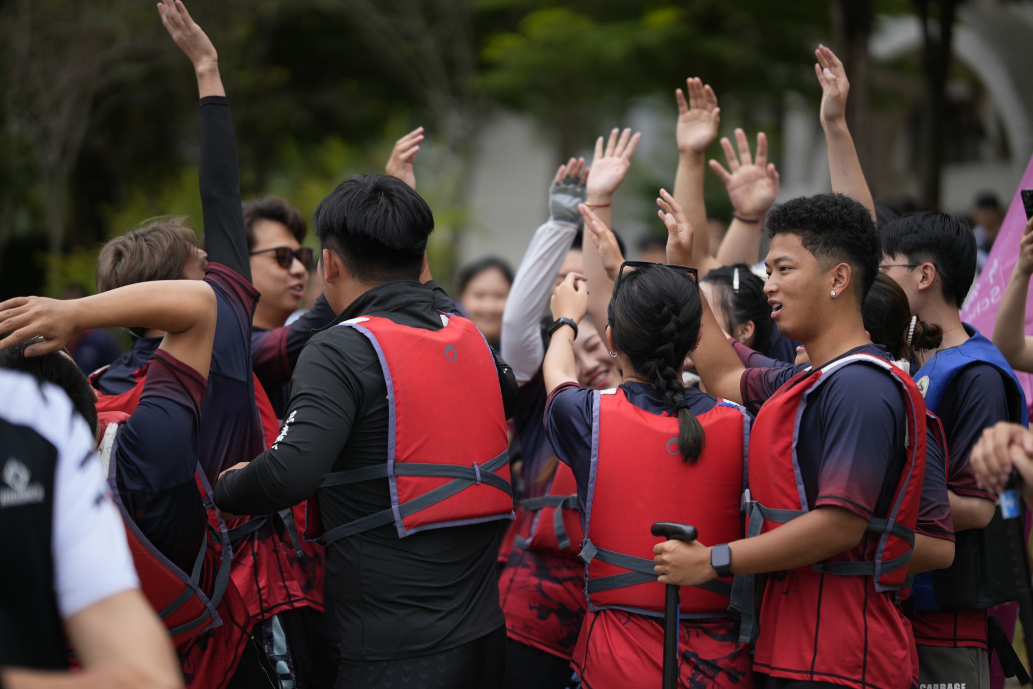 境内外学子在岸边为比赛加油呐喊