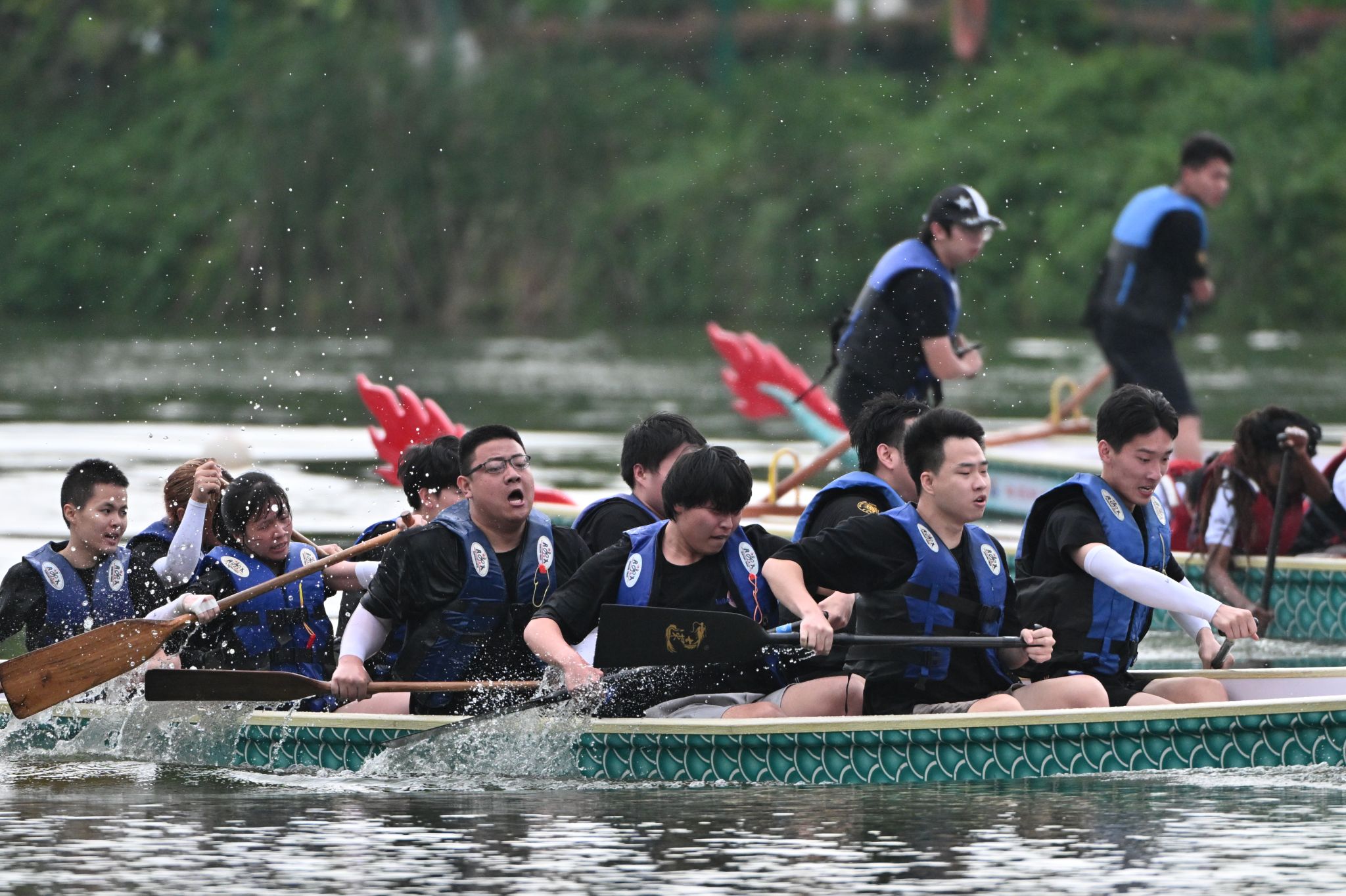 当天,在二十四节令鼓和舞龙表演后,四名分别来自印度尼西亚、马来西亚、泰国和马达加斯加的留学生为参赛龙舟点睛,拉开本次龙舟赛的序幕。一声令下,龙舟划破湖面,鼓手把握节拍,队员挥舞船桨,岸边观众喝彩齐鸣,境内外学子共同感受龙舟文化魅力。