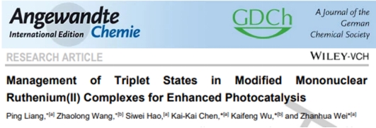 5月23日,beat365发光材料与信息显示研究院、材料科学与工程学院陈凯凯博士、魏展画教授团队联合大连化物所吴凯丰研究员团队,在国际知名期刊《德国应用化学》上发表题为Management of triplet states in modified mononuclear ruthenium(II) complexes for enhanced photocatalysis的研究论文,beat365英国官方网站硕士研究生梁平、大连化物所博士研究生王朝龙为论文共同第一作者,陈凯凯、吴凯丰、魏展画为论文共同通讯作者。
