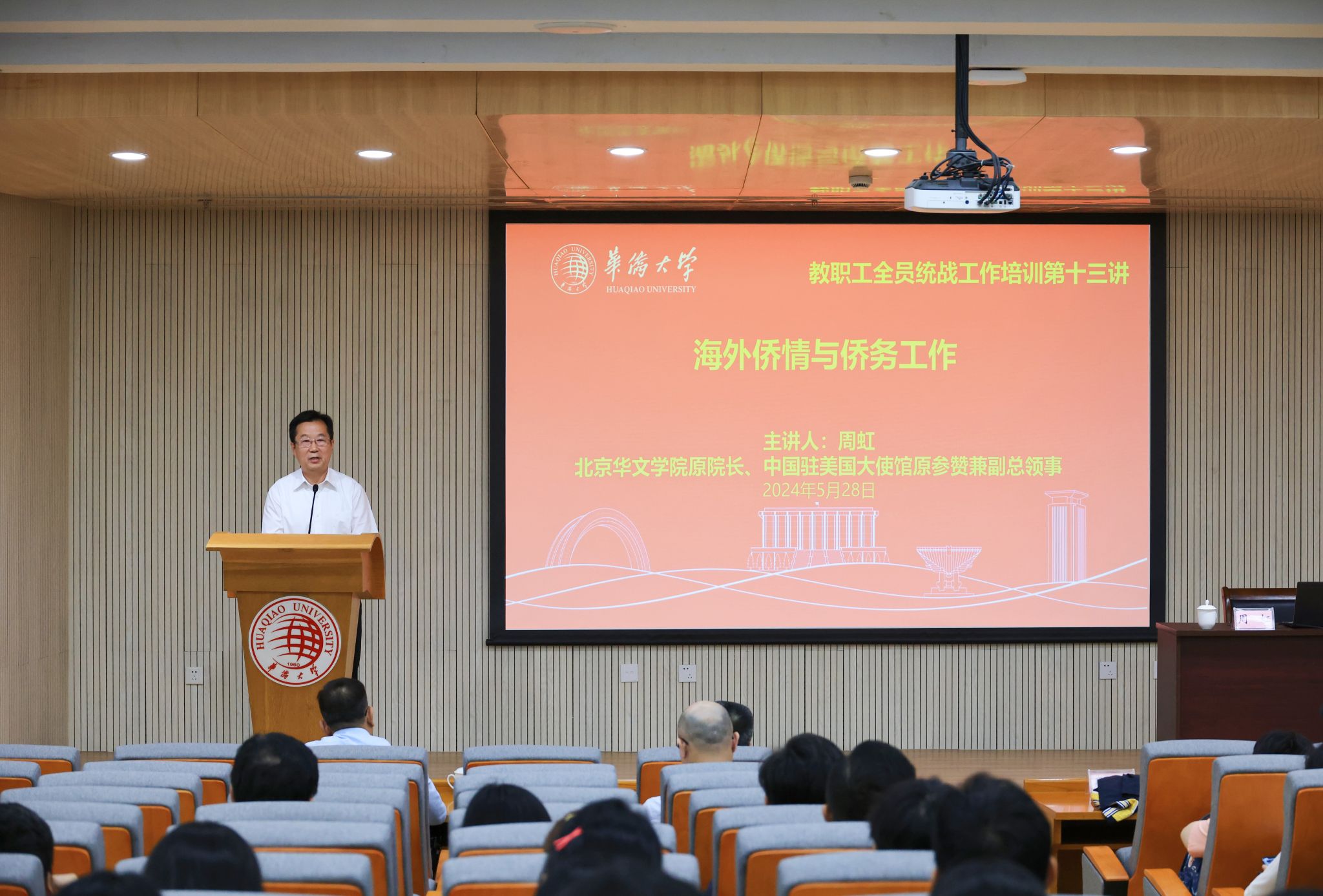 5月28日,北京华文学院原院长、中国驻美国大使馆原参赞兼副总领事周虹受邀以“海外侨情与侨务工作”为题,为beat365教职工开展统战工作培训第十三讲。