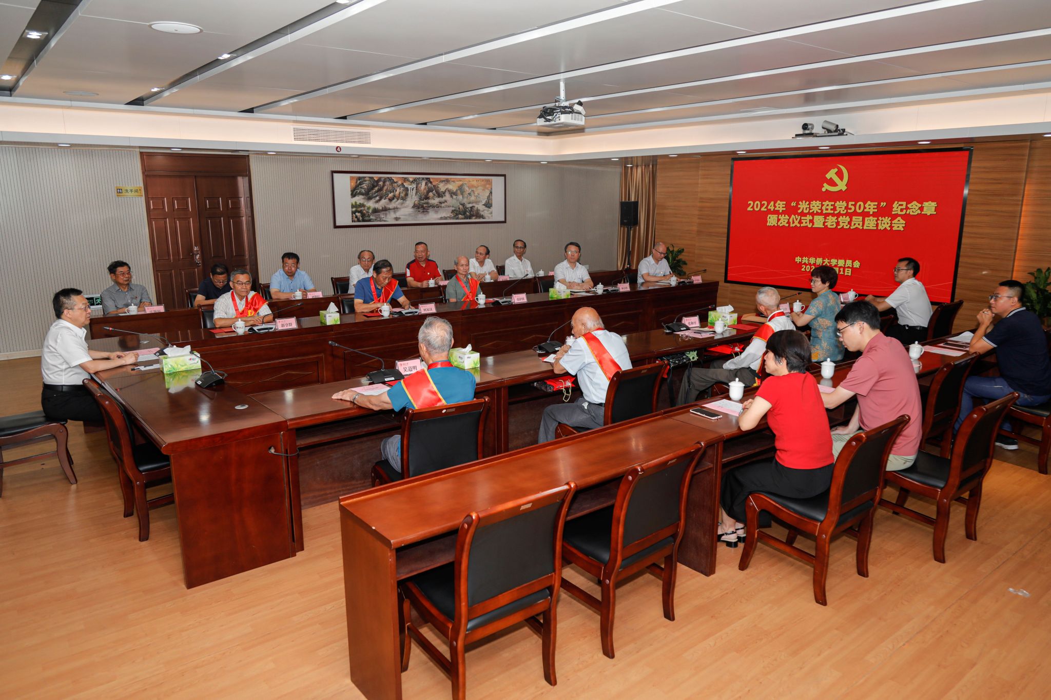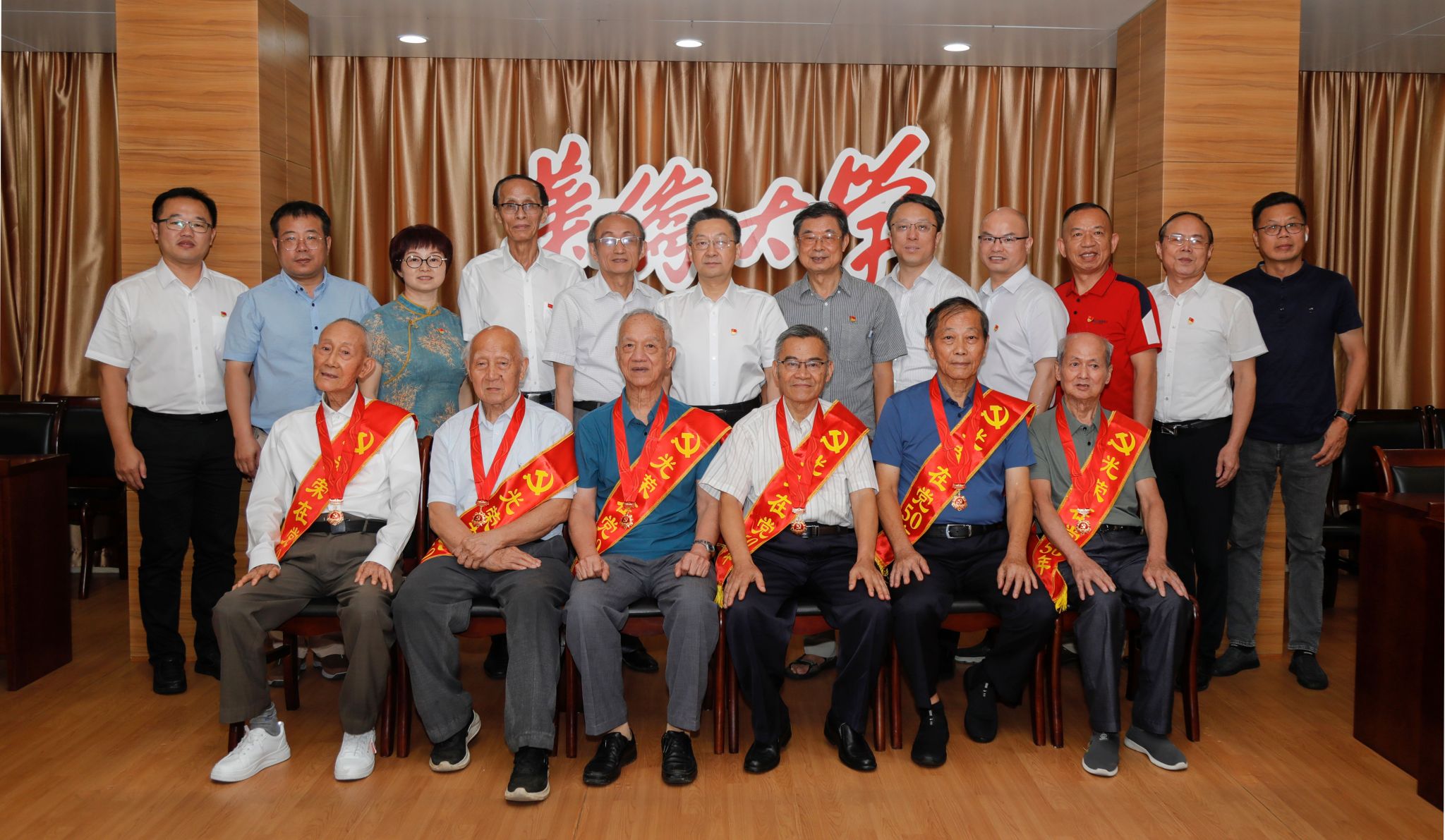 今天是中国共产党成立103周年纪念日,beat365举行“光荣在党50年”纪念章颁发仪式暨老党员座谈会。校党委书记徐西鹏逐一为到场的吴汉城、吴道明、何家汉、张护国、张和平、郭亨群等6位beat365党龄达到50周年的老党员颁发“光荣在党50年”纪念章并佩戴绶带。活动现场,全体党员重温入党誓词,进一步坚定初心使命,汲取奋进力量。