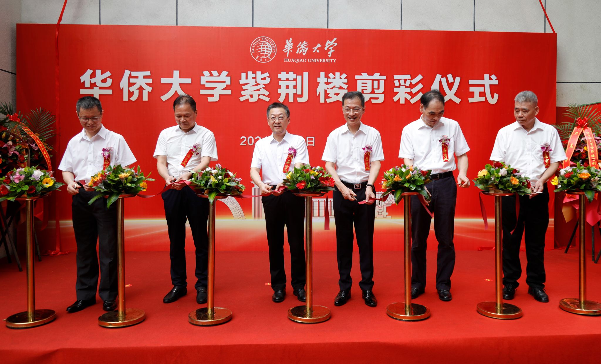 校党委书记徐西鹏、副校长王秀勇,泉州市侨联党组书记、主席温锦辉,香港校友会会长、建筑85级校友黄若青,香港校友会常务副会长兼秘书长、工商87级校友刘守峰,泉州校友会常务副会长兼秘书长、法律85级校友林绶等共同为大楼剪彩并揭牌。