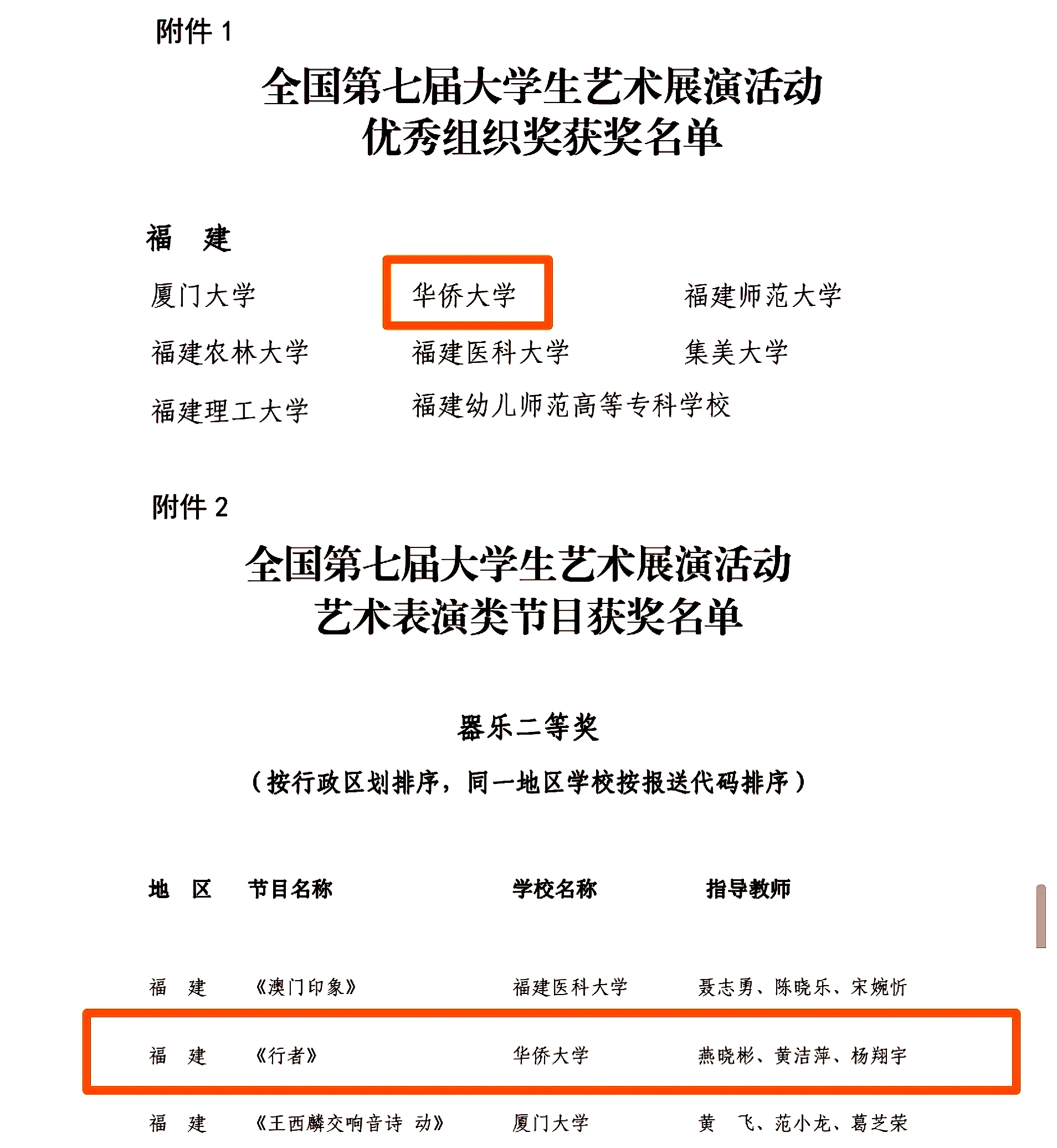 全国大学生艺术展演活动每三年举办一届,是我国目前规格最高、规模最大、影响最广的大学生艺术实践活动。近年来,beat365英国官方网站深入学习贯彻习近平新时代中国特色社会主义思想和党的二十大精神,落实《关于全面加强和改进新时代学校美育工作的意见》文件精神,大力发展素质教育,积极实施美育浸润行动,推动校园文化与美育教育有效融合,以美育人、以美化人、以美培元,创作出一系列传播当代中国价值观念、体现中华文化精神、展现侨校特色的优秀作品。