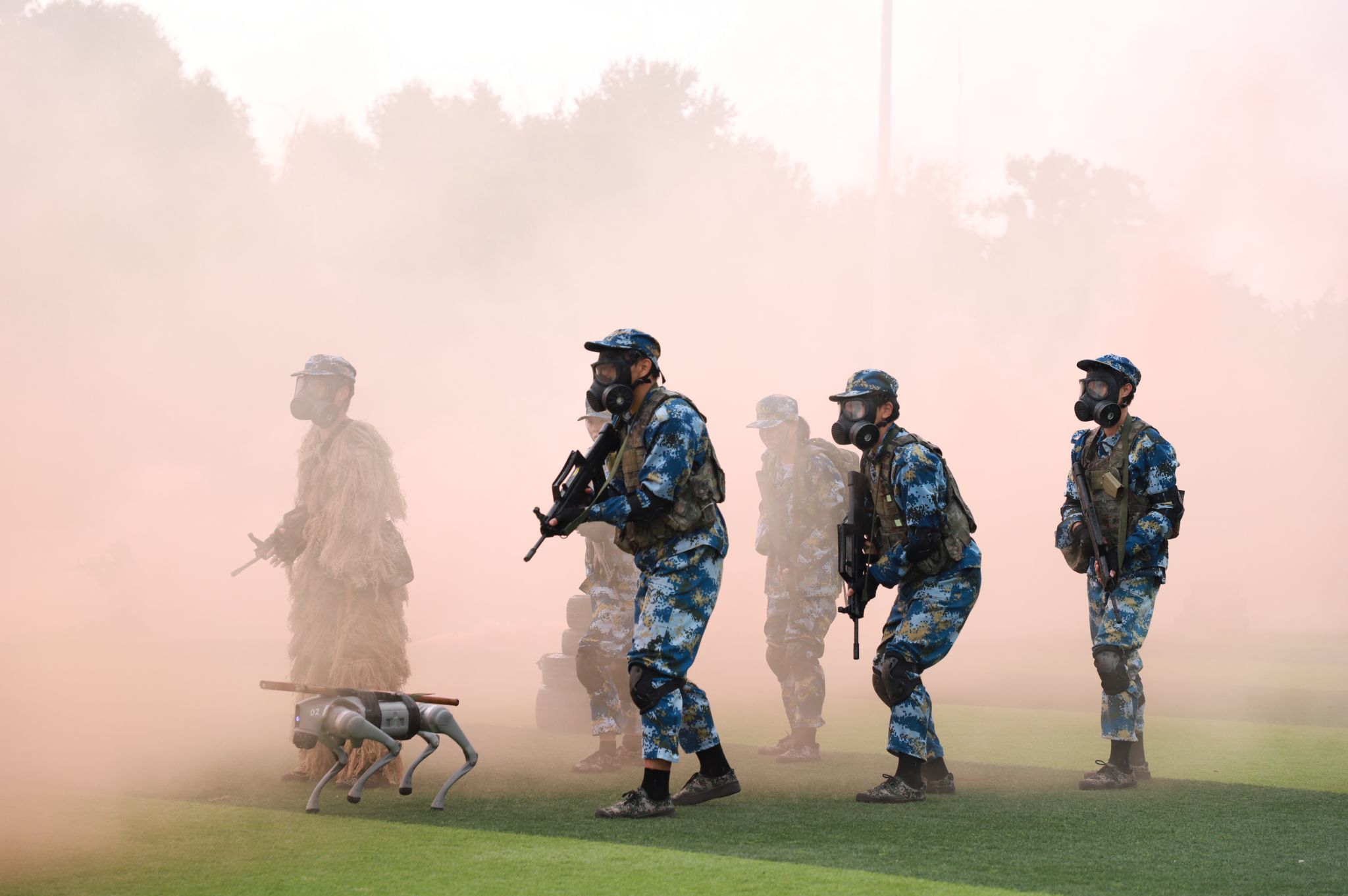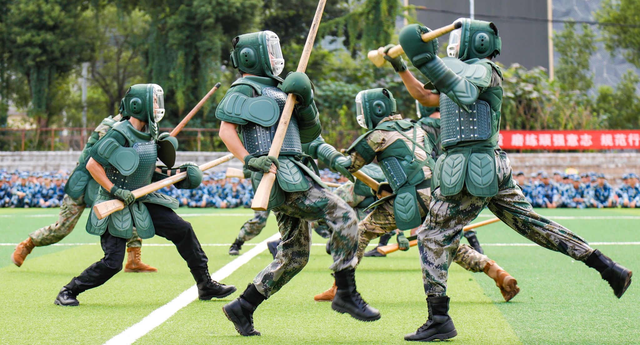 旗语方阵振臂举旗,红黄辉映,现风华;军体拳方阵、擒敌拳方阵出拳如箭,刚劲有力,展锋芒;刺杀操方阵、匕首操方阵挥刀凌厉,号声响亮,震云天。包扎、止血、搬运,配合默契而又高效,卫生与救护方阵展现出专业的急救素养。侦查、冲锋、伏击、防守、对抗,战术演练将整个会操表演推向高潮,标准迅速的战术动作,紧密流畅的团队合作,敏捷果敢的行动力,是一场难得的力量与智慧的洗礼,是精神与友情的交映。