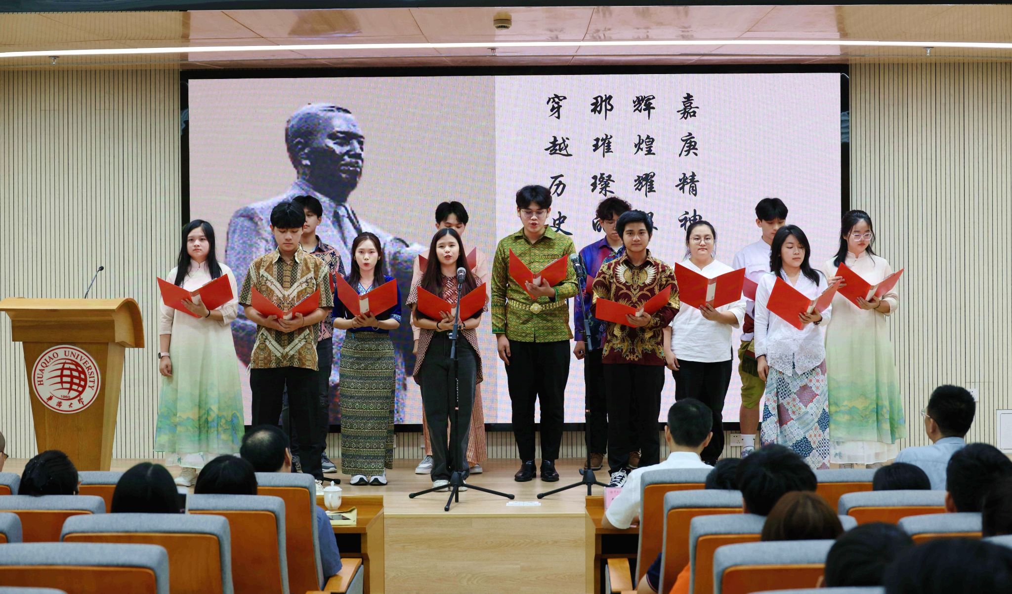 3月,学校举办“团聚阅书 铭记先贤”读书交流活动,56名陈嘉庚奖学金生相聚一堂,静心阅读陈嘉庚相关书籍,进行嘉庚精神手抄报制作,并交流阅读心得和创作思路。来自马来西亚的2021级新闻与传播学院学生梁卉欣说:“通过共同制作手抄报,大家进一步交流了对陈嘉庚先生的了解与感悟。先生不仅是一名企业家,更是一位毕生热诚为国兴学育才的教育家,他的事迹激励着我们在未来的道路上秉承其精神,勇往直前,并将嘉庚精神传承弘扬。”月底,厦门市集美区经典诵读进校园——“诵读经典 缅怀先烈”beat365英国官方网站专场举办,朗诵者们以《嘉庚的孩子》《春天的记忆》《嘉庚颂》《百年正青春》等作品讲述嘉庚事迹,弘扬嘉庚精神,传承红色基因。“我们要弘扬嘉庚精神,诚以待人,毅以处事,因为我们都是嘉庚的孩子。”大家如是说。