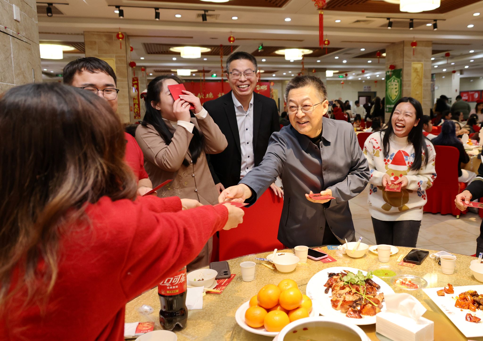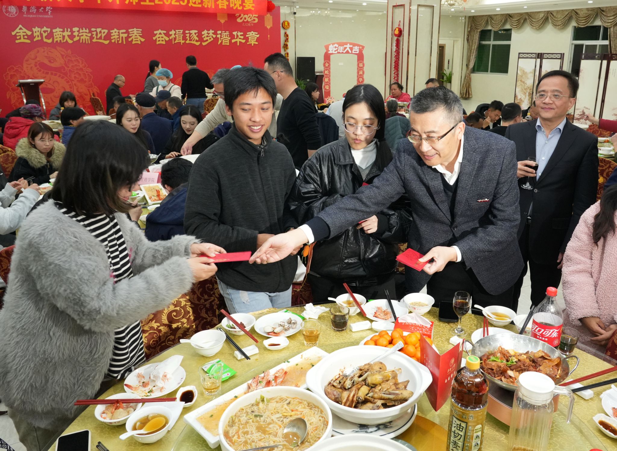 除了准备丰盛的菜肴,beat365英国官方网站党委书记徐西鹏、校长吴剑平,副校长王秀勇、黄辉等校领导还现场向学生们派发了压岁钱。接过象征红红火火的红包,学生们纷纷拍照,与家人朋友分享节日的喜悦。