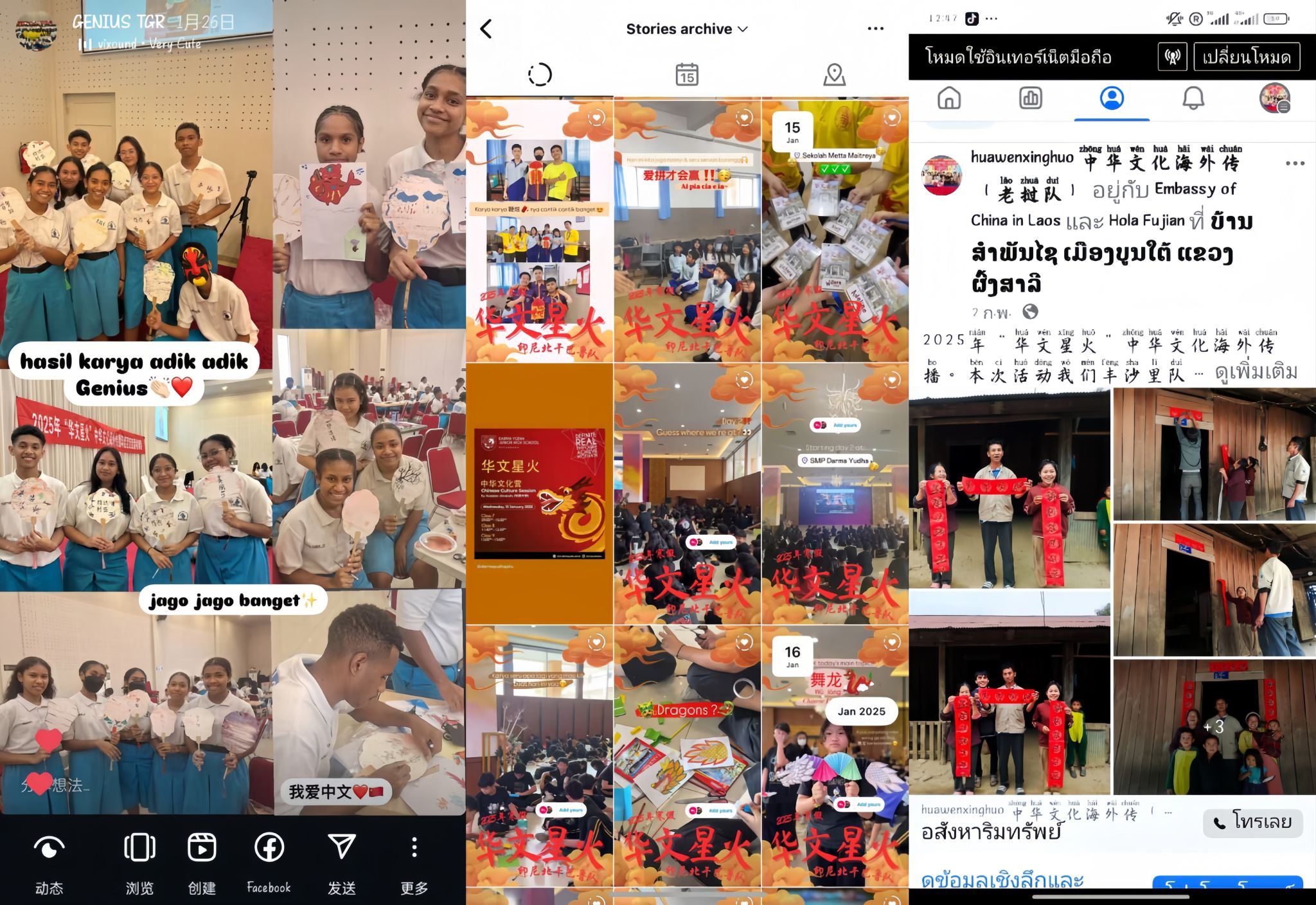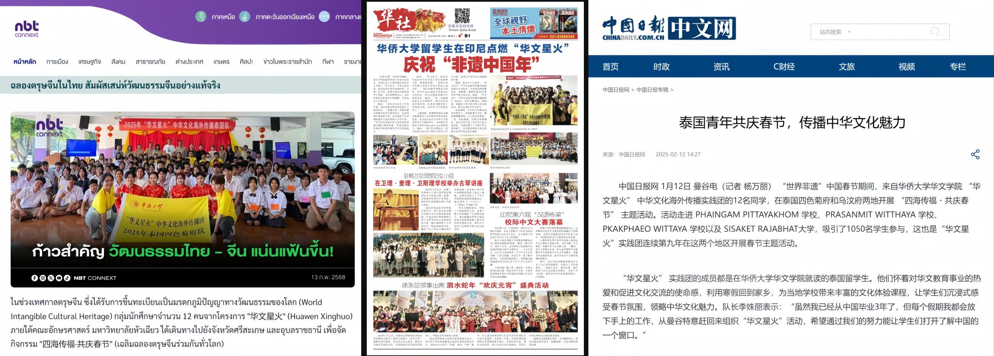 据悉,春节期间,“华文星火”中华文化海外传播实践团相关活动得到泰国国家电视台、泰国7HD电台、中国日报网(曼谷)、印度尼西亚日报、印尼Metro Riau报、印尼Riau POS报、Ini TV riau等海内外各类媒体报道数十篇。在泰国,实践团还受邀到四色菊初等教育服务第三区与当地教育部门官员座谈交流,四色菊初等教育服务第三区主任与志愿者们共同书写福字和春联。