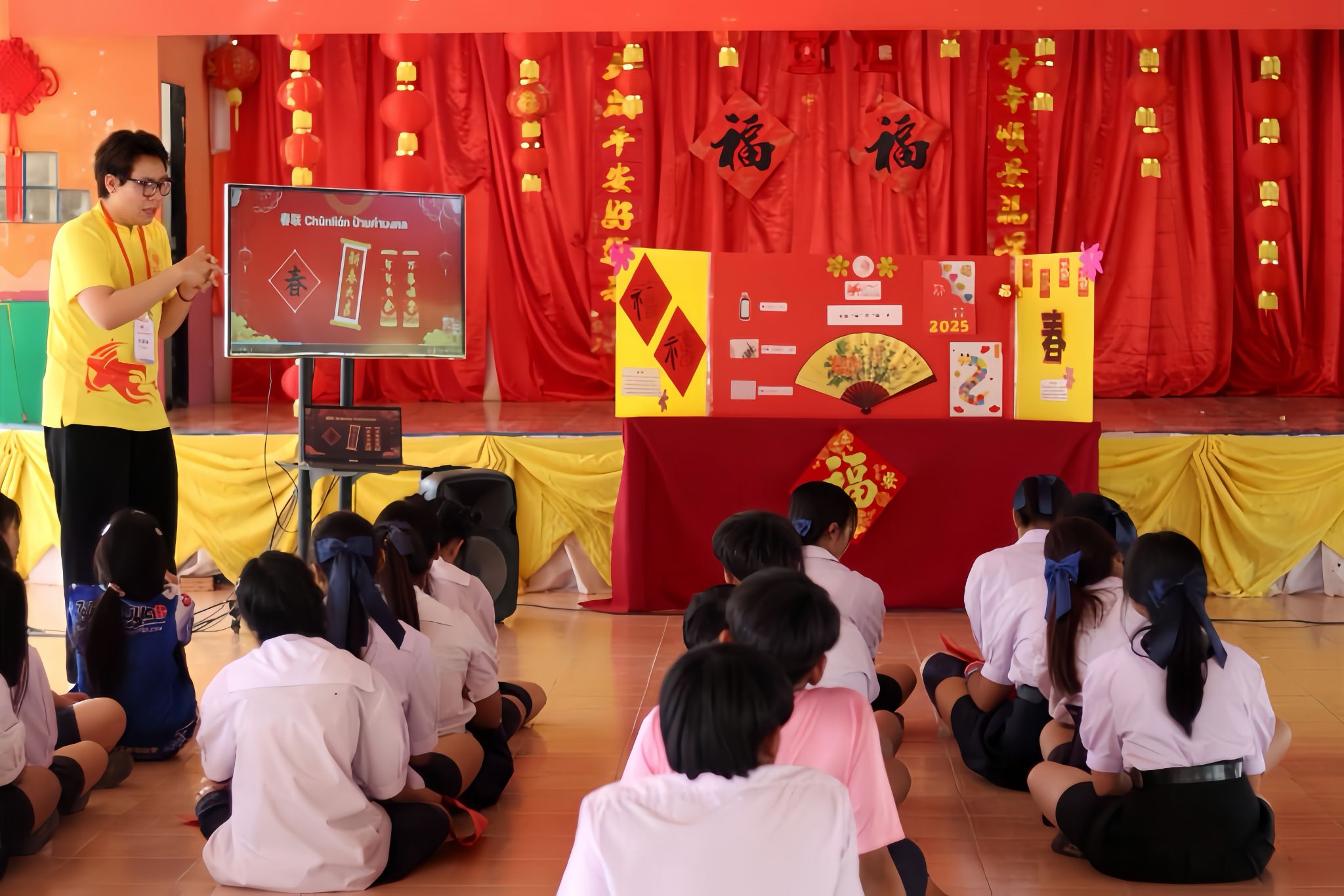 课堂上,他们开讲“非遗春节”文化。“春节申遗成功意味着它不再仅仅是一个节日,它的影响力已超越国界,成为全人类共享的文化盛宴。”实践团泰国志愿者张浩哲在PRASANMIT WITTHAYA学校的课堂上为泰国青年讲述着“非遗春节”蕴藏的多元价值。今年恰逢中泰建交50周年,除了年俗文化,泰国志愿者们还结合中泰铁路、教育协作等方面设计高阶文化课程,让更多青少年了解“中泰一家亲”的内涵。