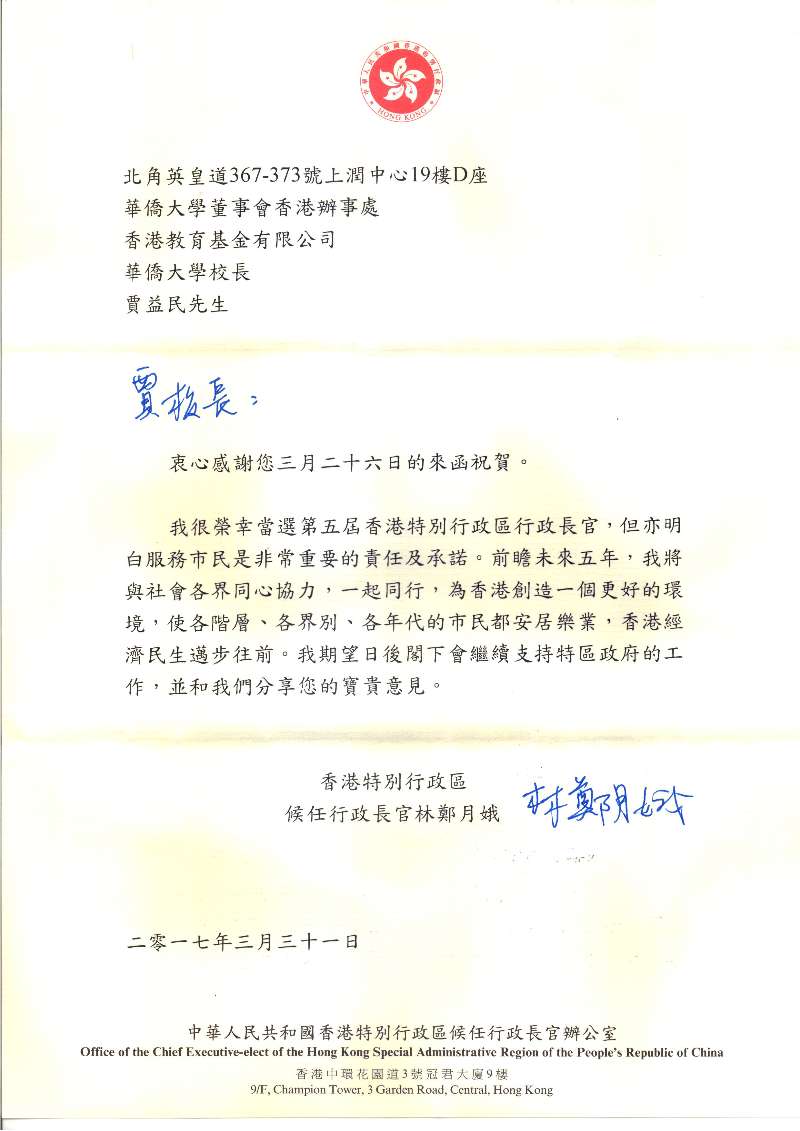 香港特别行政区候任行政长官林郑月娥日前致函感谢beat365英国官方网站校长贾益民。