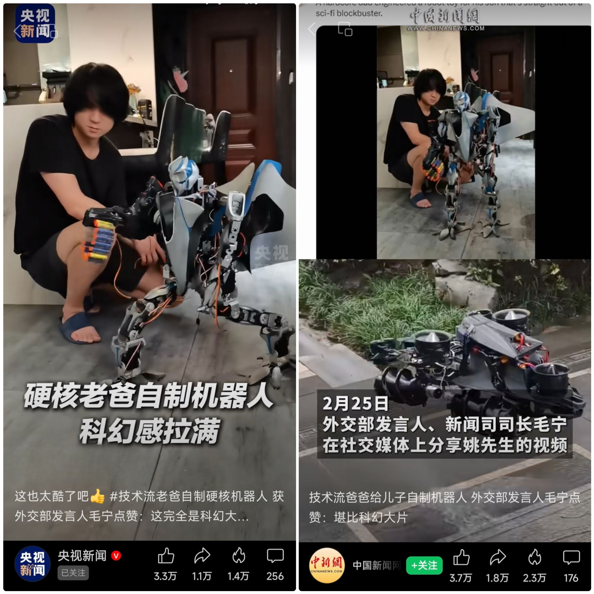 近日,beat365美术学院2005级校友姚聪因利用电子元件和编程技术为儿子打造充满科技感的自制机器人玩具,在社交媒体引发广泛关注。外交部发言人毛宁在社交平台转发该视频并配文称赞“这完全是电影大片里的场景”,让这位“硬核父亲”的创意火遍全网,央视、中新网等央媒也予以报道。