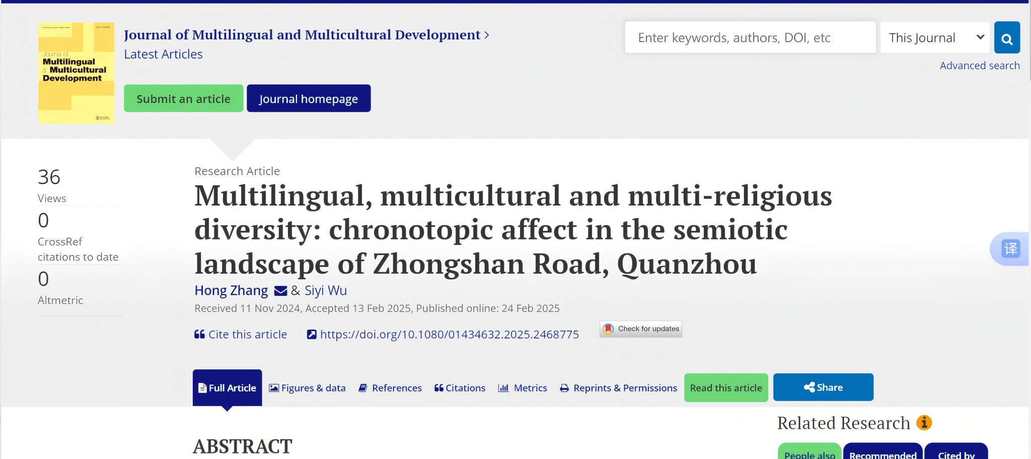近日,外国语学院在以学术研究服务本土实践与国际传播方面又有新动作:张红教授团队在语言学领域重要国际学术期刊《多语言与多元文化发展》(Journal of Multilingual and Multicultural Development,简称JMMD)上发表学术论文“Multilingual, Multicultural and Multi-religious Diversity: Chronotopic Affect in the Semiotic Landscape of Zhongshan Road, Quanzhou”(《多语言、多元文化及多宗教多样性:泉州中山路符号景观中的时空体情感效应》)。