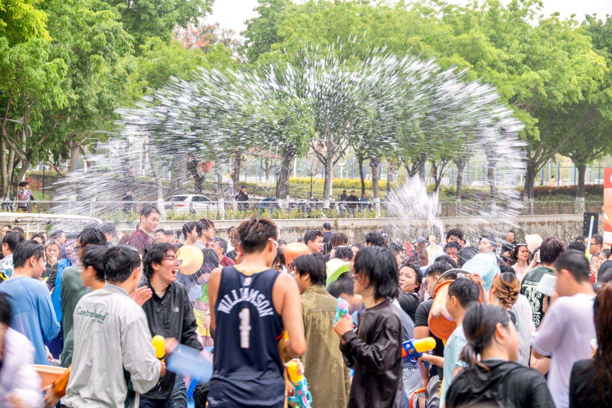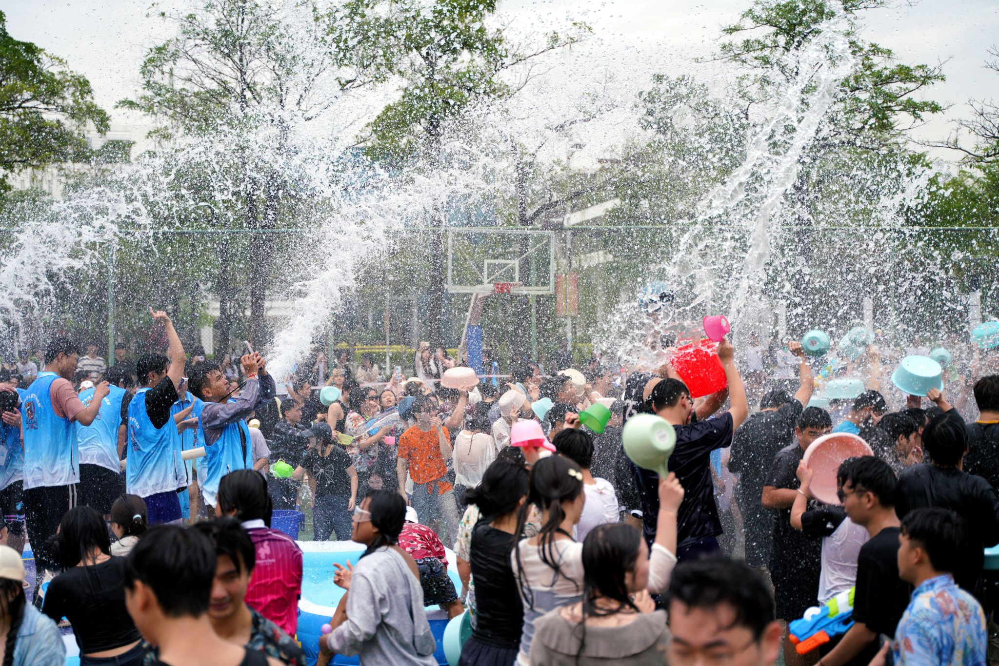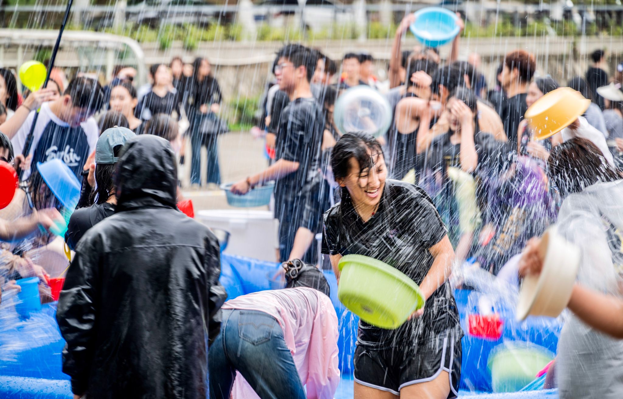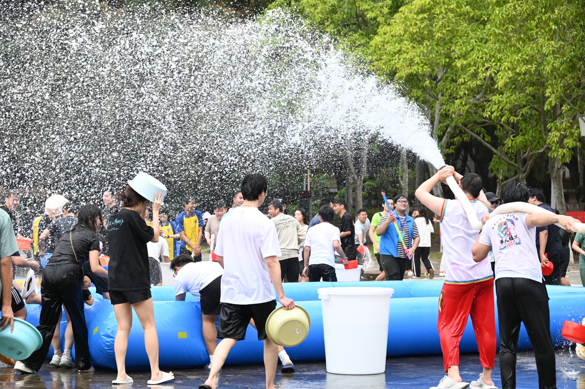 泼天欢乐笑声漾,绵绵祝福情谊长。令人兴奋的泼水时刻到来,现场欢乐氛围达到高潮,师生一起冲入场地中央,开启一场水花与祝福的狂欢。水盆、水瓢等各色工具齐上阵,水珠与笑声在热烈氛围中一同炸开,各国学子扬起水花,互相祝福,增进情谊。