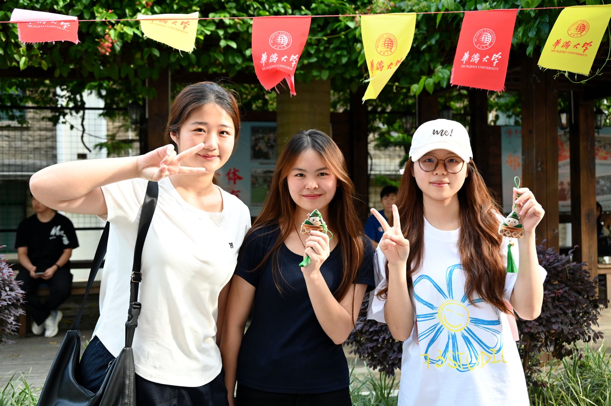 在手工体验区,海内外学子共同体验制香囊、编五彩手绳、做艾草挂件等传统民俗。同学们或低头专注穿针引线,或相互交流“平针绣”“锁边缝”技巧,在协作中重现传统手工艺的细腻与温度。来自斯里兰卡的留学生黄一一举起刚缝好的香囊和艾草挂件,“在我们国家没有这样的节日,去年在电视上看到中国的端午活动在斯里兰卡首都科伦坡举行,感觉非常有趣,这次我也能现场体验端午节日氛围,了解丰富多彩的端午传统文化。”