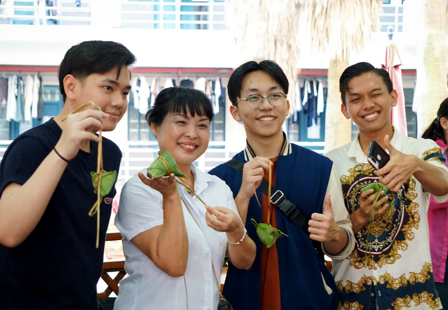 学生社区中心阿姨指导留学生包粽子(吴江辉/摄)