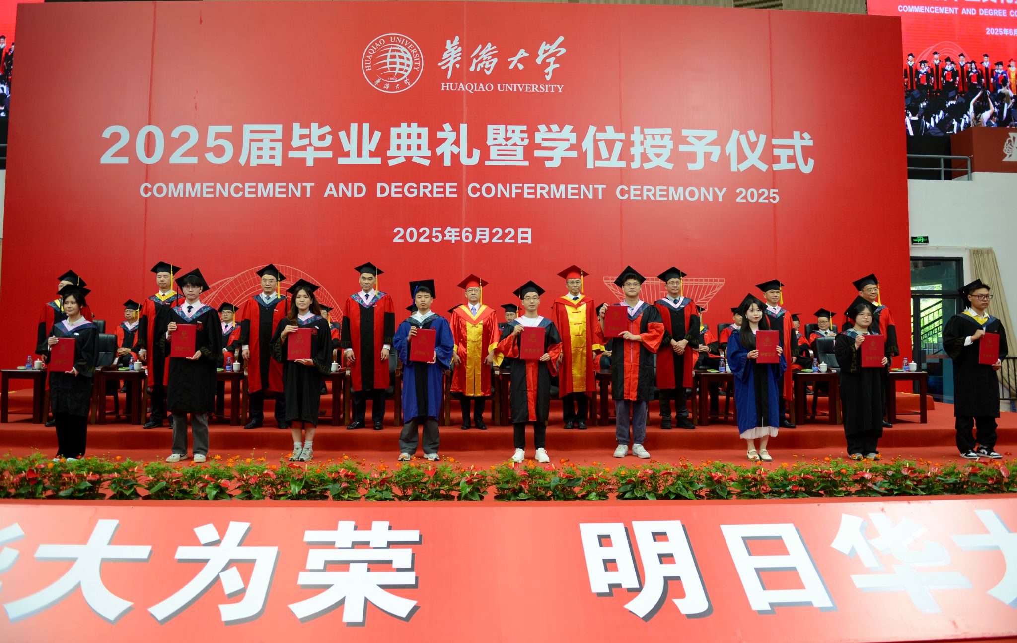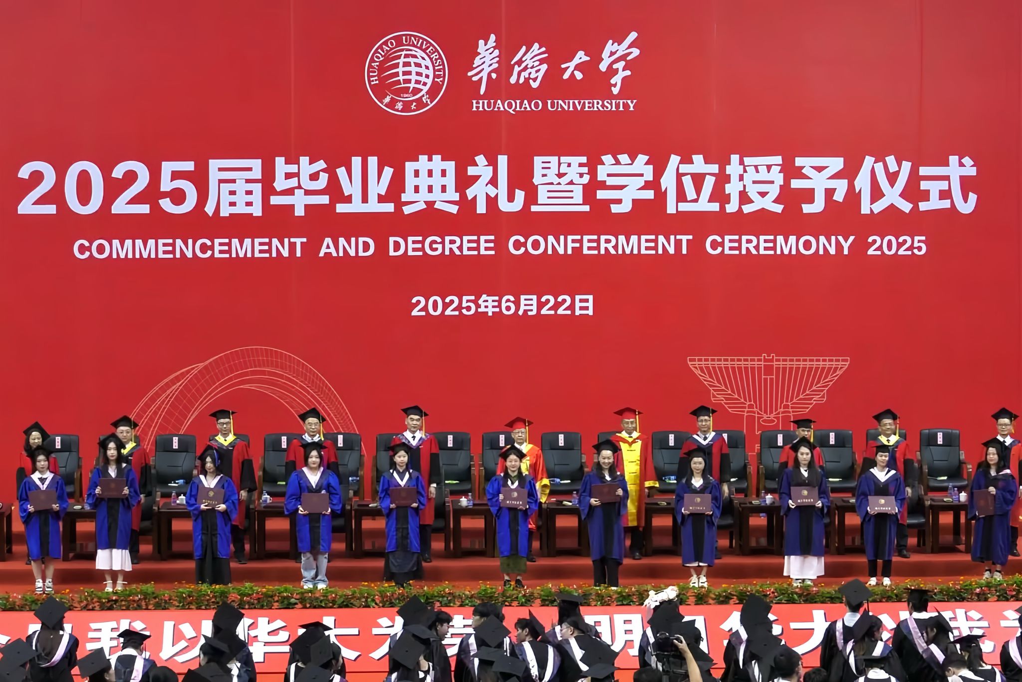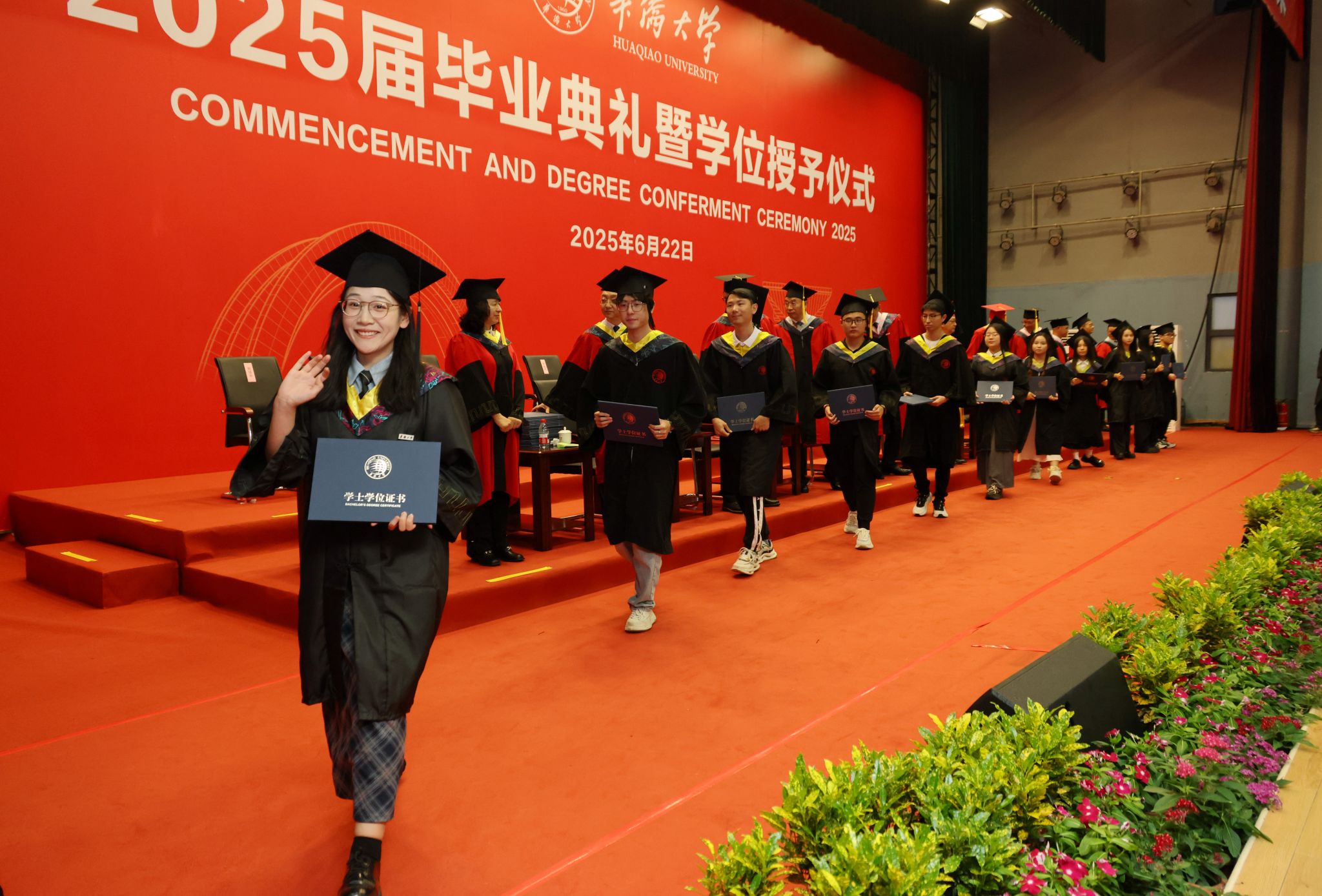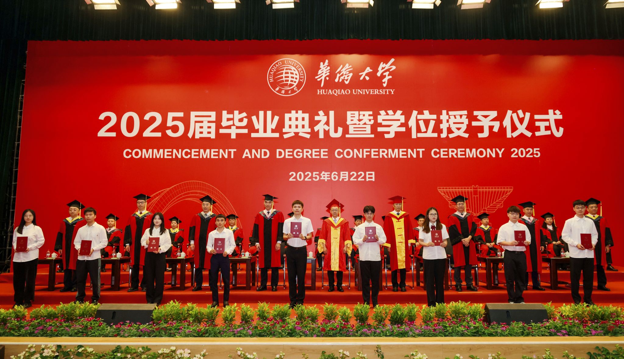 典礼暖场环节,学校播放了为同学们精心制作的毕业MV、电子相册、建校65周年沙画视频等,一幕幕场景串联起毕业生们最美的青春回忆。境内外生代表共同演唱《相亲相爱》《凤凰花开的路口》等歌曲,将跨越山海的热忱揉进旋律,诉说同窗情谊;各学院毕业生及教师代表联唱《那些花儿》《像你这样的朋友》等,满含对母校的深情回望、对同窗的依依惜别,更寄托着奔赴未来的坚定与期待。