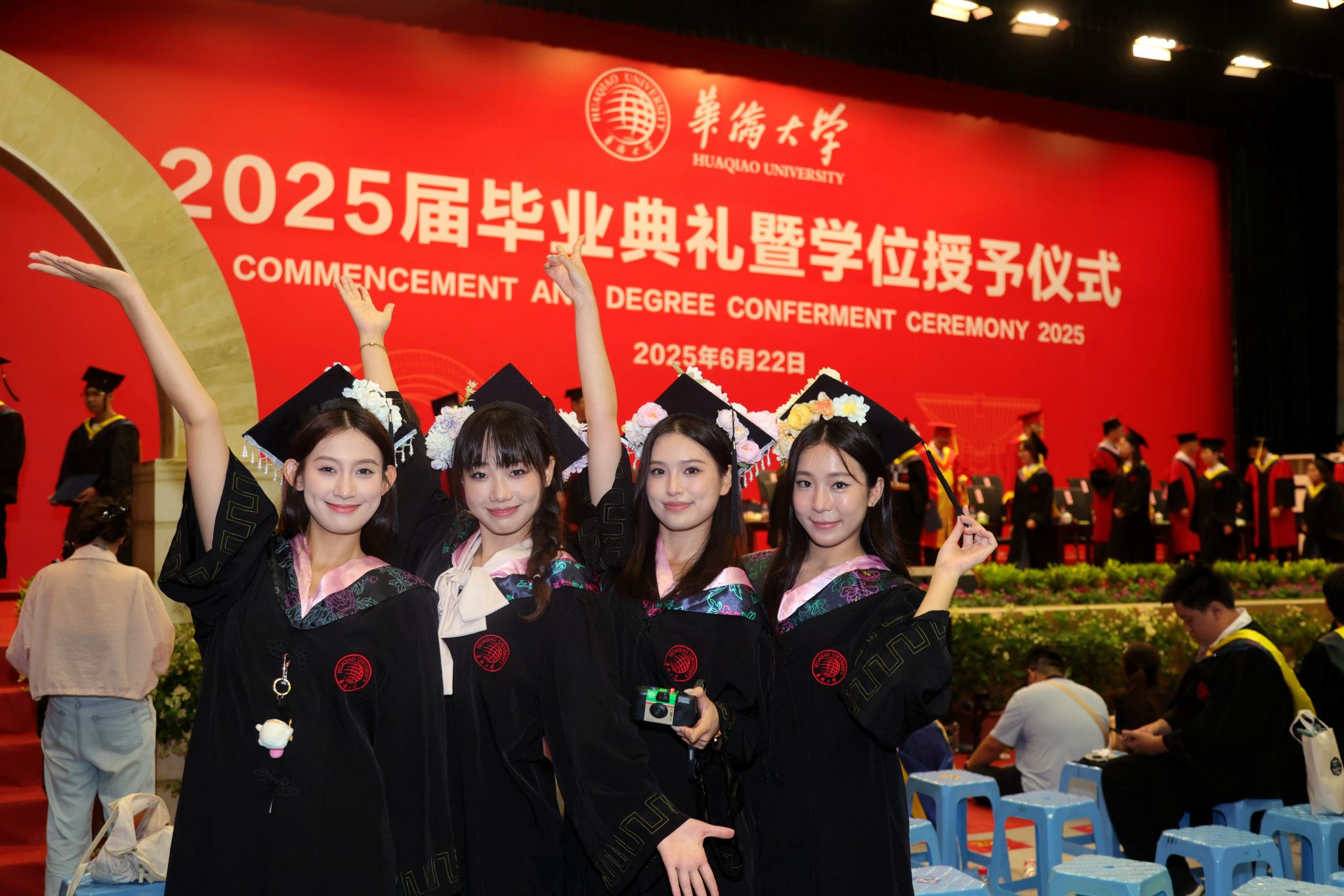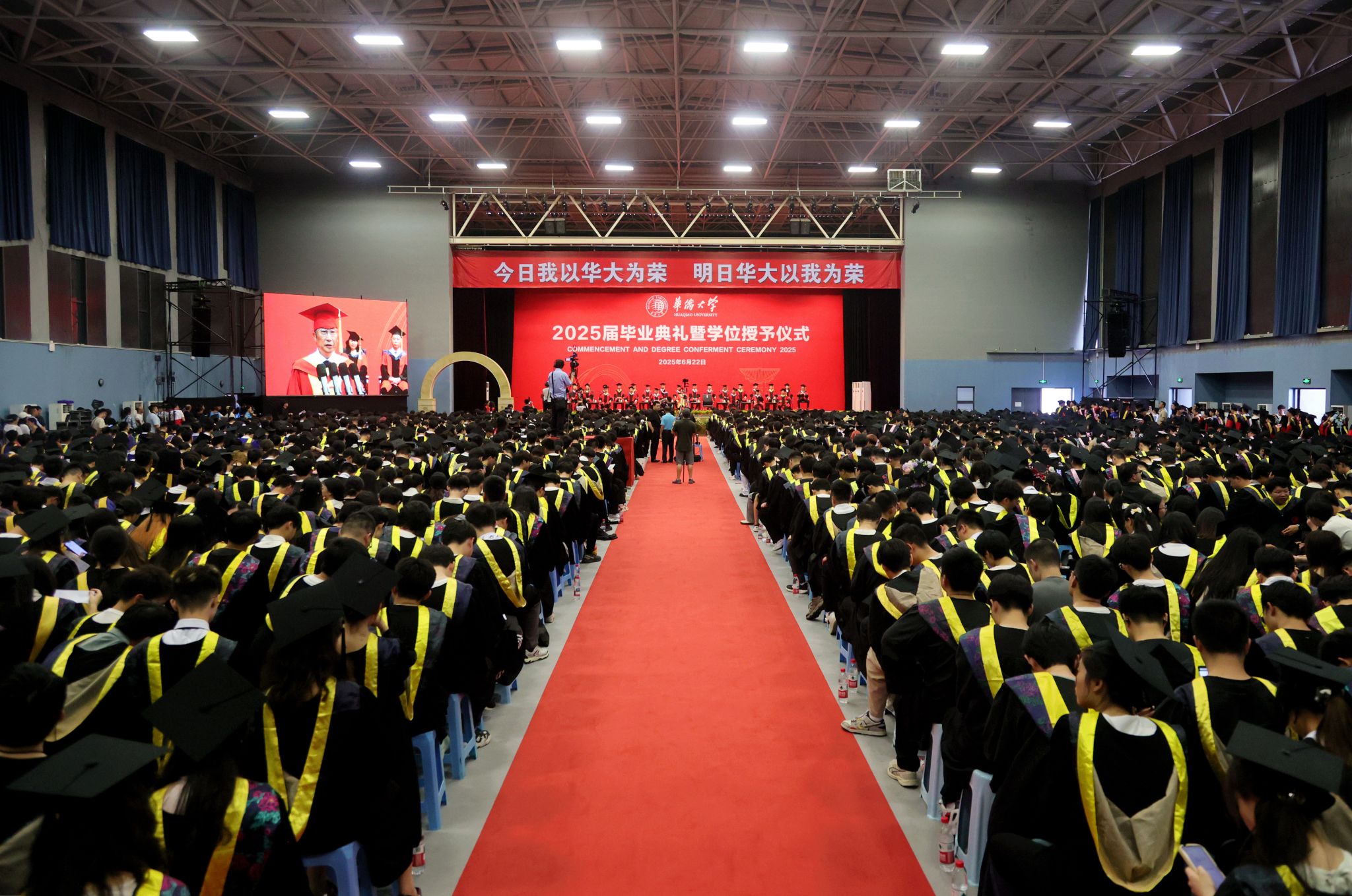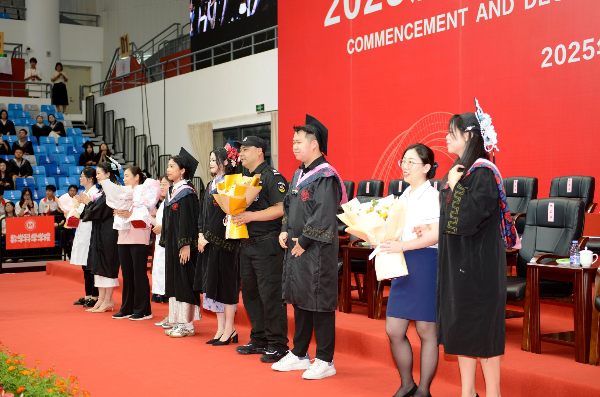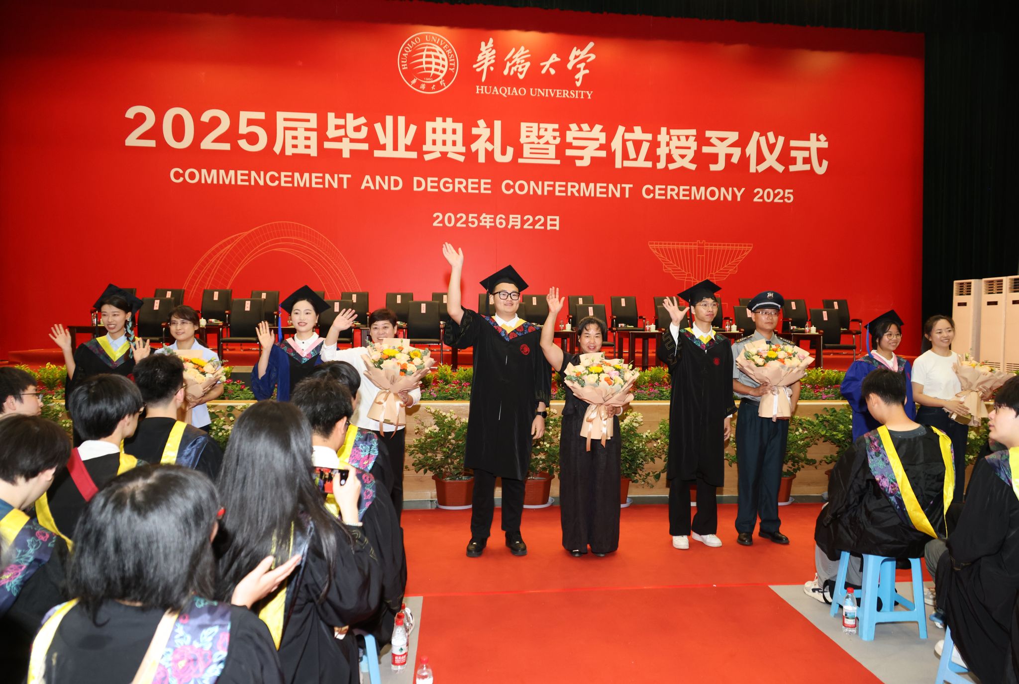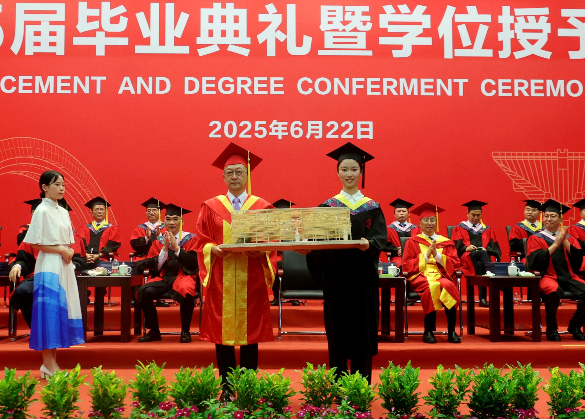 典礼暖场环节,学校播放了为同学们精心制作的毕业MV、电子相册、建校65周年沙画视频等,一幕幕场景串联起毕业生们最美的青春回忆。境内外生代表共同演唱《相亲相爱》《凤凰花开的路口》等歌曲,将跨越山海的热忱揉进旋律,诉说同窗情谊;各学院毕业生及教师代表联唱《那些花儿》《像你这样的朋友》等,满含对母校的深情回望、对同窗的依依惜别,更寄托着奔赴未来的坚定与期待。