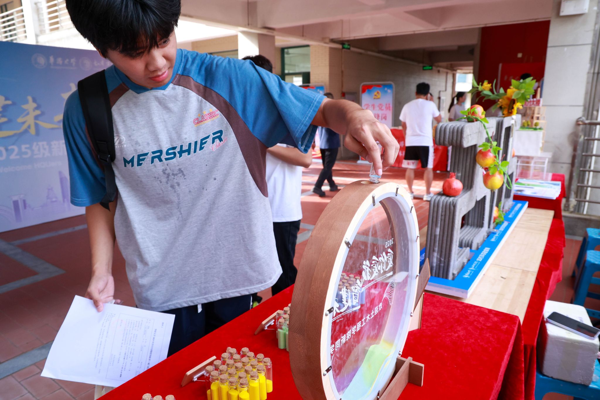 工学院展出高精度机械臂、QAV250无人机等学长学姐的创新作品,直观展现工科魅力,激励新生追求卓越;炫酷的机器人和机器狗成为信息与工程学院迎新现场的焦点,它们精准接收指令,完成握手、挥手、跳跃等动作,鼓励新生在科技世界大胆探索;美术学院独具匠心,巧妙融入泉州非遗文化,学长学姐们簪花欢迎新生,并设计漆扇体验和绘画卡通人等特色活动,让新生沉浸式感受传统文化的魅力;文学院设置“文脉盲盒”经典典籍节选,新生拆盒品书香,传递文字底蕴。