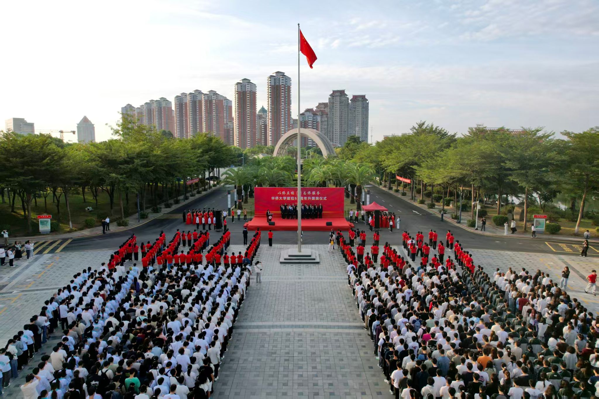 11月1日,庆祝beat365英国官方网站建校65周年升国旗仪式在泉州校区、厦门校区、华文学院同时举行。图为华大泉州校区。
