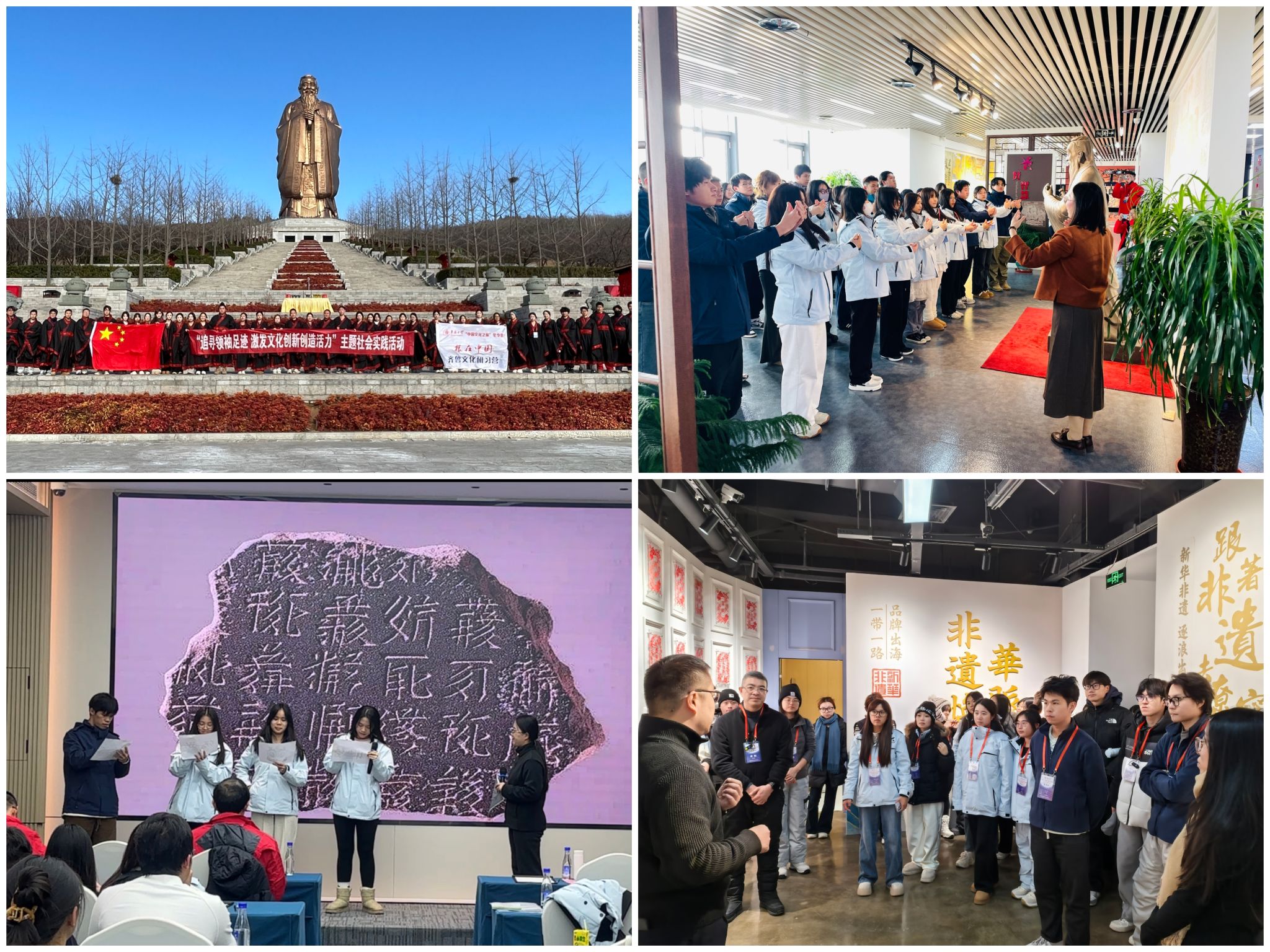 实践导师在途中组织专题讨论,引导学生从规划理念、运营模式和社会效益等角度分析文旅产业高质量发展的现实路径,帮助学生认识到文化不仅是历史记忆,更是推动区域发展和增强文化自信的重要资源。经济与金融学院中国澳门学生苏同学表示,“在行走中深度触摸齐鲁大地的文脉与风骨,我明白传承不仅仅是书本上的文字,而是一种呼吸着的鲜活的文明。”