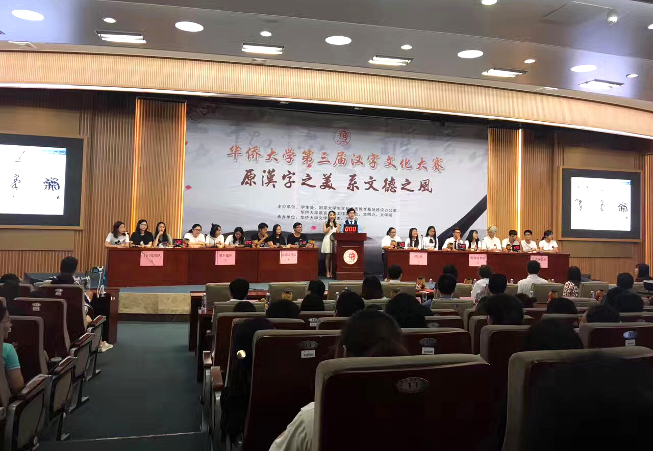 本届汉字文化大赛主题是“原汉字之美,系文德之风”,自5月在全校开展以来,共有17个学院的20支队伍报名参赛,每队3人,其中至少1人为境外生。经过初赛,来自华文学院的“望舒队”、文学院的“明德格物队”、工商管理学院的“有我师焉队”、法学院的“逍遥法外队”、外国语学院的“慵不能队”经济与金融学院的“16国四队”共6支队伍闯入决赛。其中“16国四队”的三名队员均为境外生。