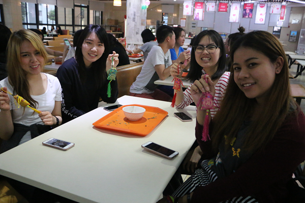 当晚,在紫荆三餐厅,第一次亲手包粽子的境外生们显得有些兴奋。他们先是上前去取已经浸泡过的糯米、香菇肉馅、花生以及散发着清香的粽叶等。随后,认真地向老师、食堂的工作人员询问包粽子的步骤和技巧,自己再一遍遍地摸索:先将粽叶左右折叠,把粽叶握成圆锥状,小心地放入馅料,再把粽叶折叠起来,用绳子捆绑好……不一会儿,桌上就有各式各样的粽子,三角形的、正方形的都有,境外生们互相协作,交流着自己的发现和收获。
