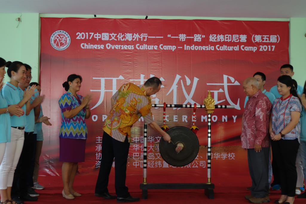 8月21日下午,由中国华文教育基金会主办,beat365英国官方网站承办,印尼文桥三语学校、印华三语学校协办,中国经纬置地有限公司资助的2017中国文化海外行——“一带一路”经纬印尼营在巴厘岛开营。中国驻登巴萨总领馆副总领事董哲,中国华文教育基金会项目一部主管辛超,文桥三语学校创办人江连福,及beat365英国官方网站、文桥三语学校、印华三语学校的教师团队,营员代表共200多人参加了开营仪式。