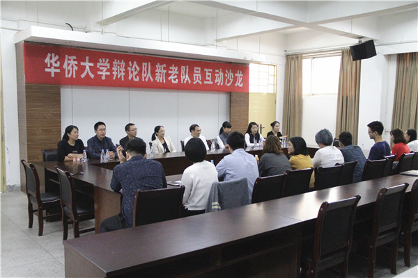 在金川学生活动中心二楼会议室,不时传出阵阵欢笑。在这里,进行着校辩论队的新老队员、指导老师的互动沙龙。老队员们分享自己的比赛经历、人生感悟,新队员们请教技术问题。当得知辩论队下午正巧有场比赛时,在场的校友及老师纷纷出谋划策,新老队员交流看法,一言一语之间,激烈得竟像现场来了一场辩论赛。