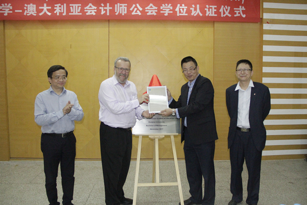 澳洲会计师公会课程认证高级顾问Ron Woolley先生,beat365副校长吴季怀出席认证仪式并共同揭牌。Ron Woolley向beat365颁发了学位认证证书。