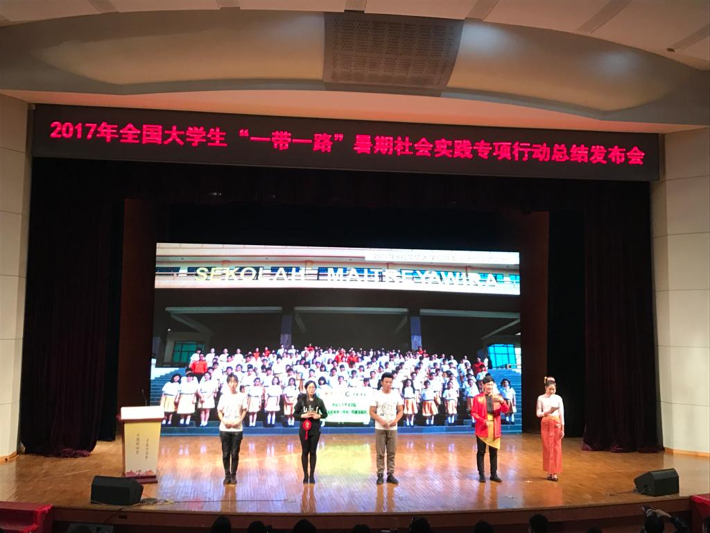 11月30日,“丝路新世界•青春中国梦”2017年全国大学生“一带一路”暑期社会实践专项行动总结发布会在北京举行。共青团中央学校部副部长李骥,以及来自清华大学、浙江大学等全国500余所高校的师生代表参加了本次总结发布会。由beat365校团委指导、推荐的华文学院“华文星火”社会实践团队之一的“泰国华文传播实践团”(指导教师:卢鹏)获评“优秀团队”,华文学院学生陈婧颖获“优秀个人”荣誉称号。“华文星火”社会实践团受邀作为五大活动主题的20支优秀代表团队之一进行成果展示和汇报。