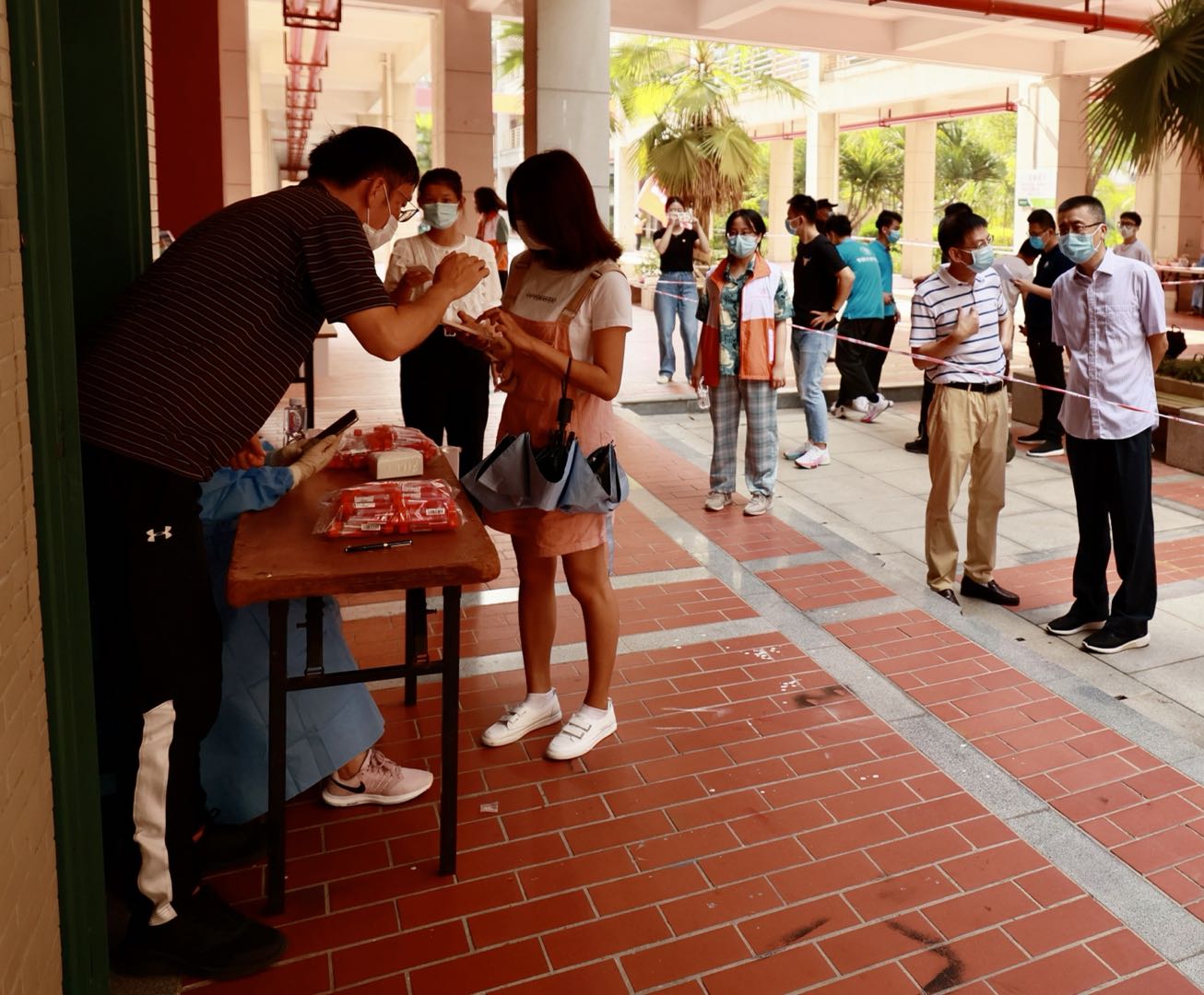 当天,学校在厦门校区教学长廊设置了3个检测点,师生员工自觉间隔一米排队,提前备好“核酸检测二维码”,通过体温检测、手部消毒、信息采集(扫二维码),便捷地完成核酸采样,并有序离开采样区。