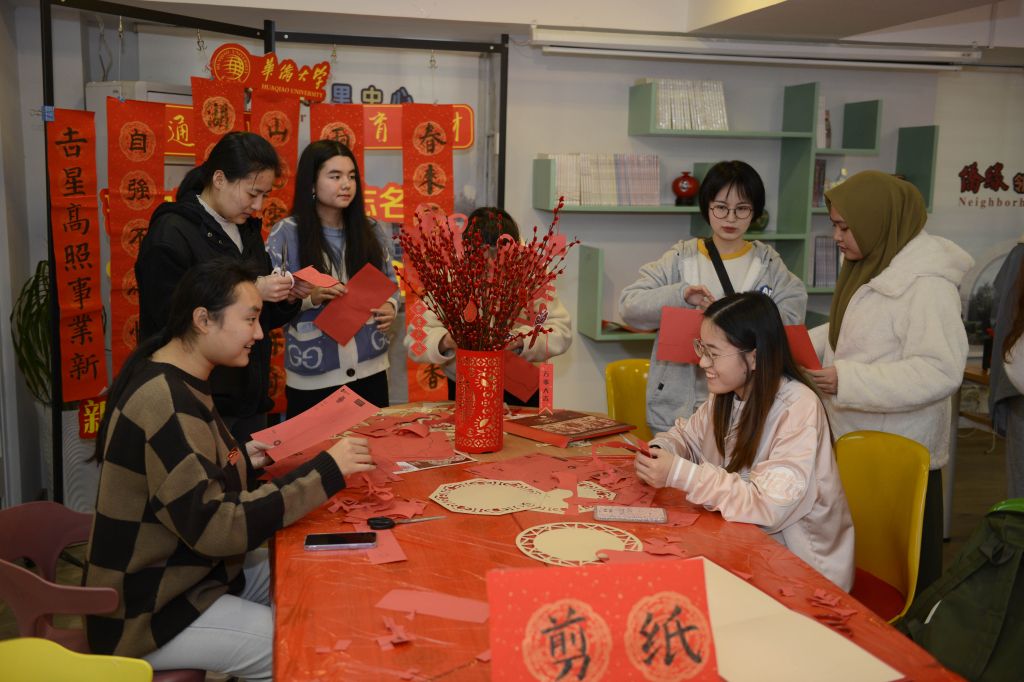 来自印度尼西亚的学生福佳则在一旁认真地剪着窗花,“因为明年是虎年嘛,所以我剪了一只老虎。”在来到中国前,福佳还没接触过中文,而现在就读文学院的她已经能说一口流利的普通话,她说,“在学校过年感觉很热闹,希望大家新的一年每天都开开心心。”