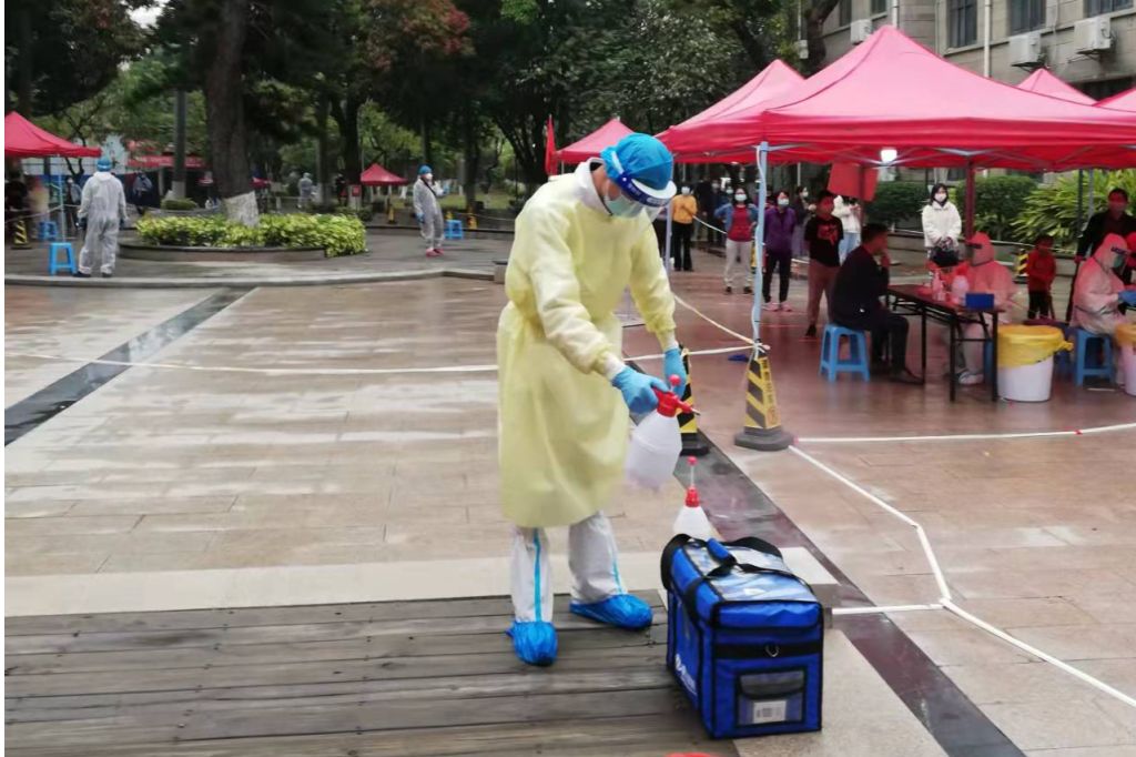 每一次核酸检测,在北区田径场,总能看到一名中年汉子,身穿防护服,来来回回地穿梭在一道道检测通道之间,他佝偻的身子异常“醒目”。