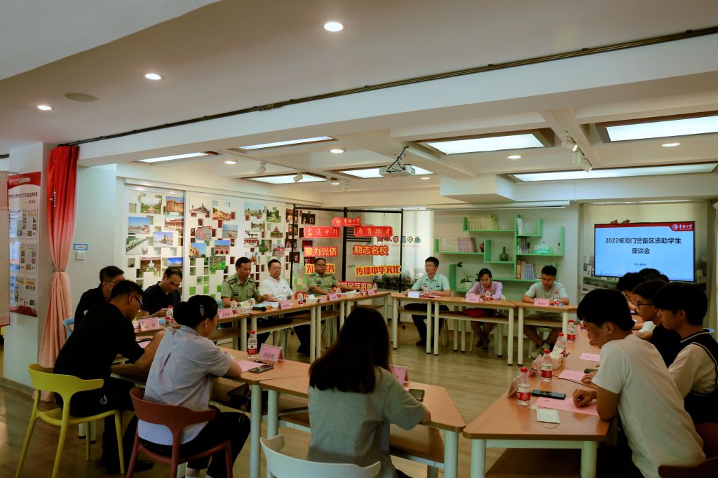 6月24日下午,厦门警备区政治委员蔡建新来校与11名受助学生代表座谈。beat365党委书记徐西鹏、副校长王秀勇,厦门警备区相关领导以及beat365学生处负责人参加了座谈会。